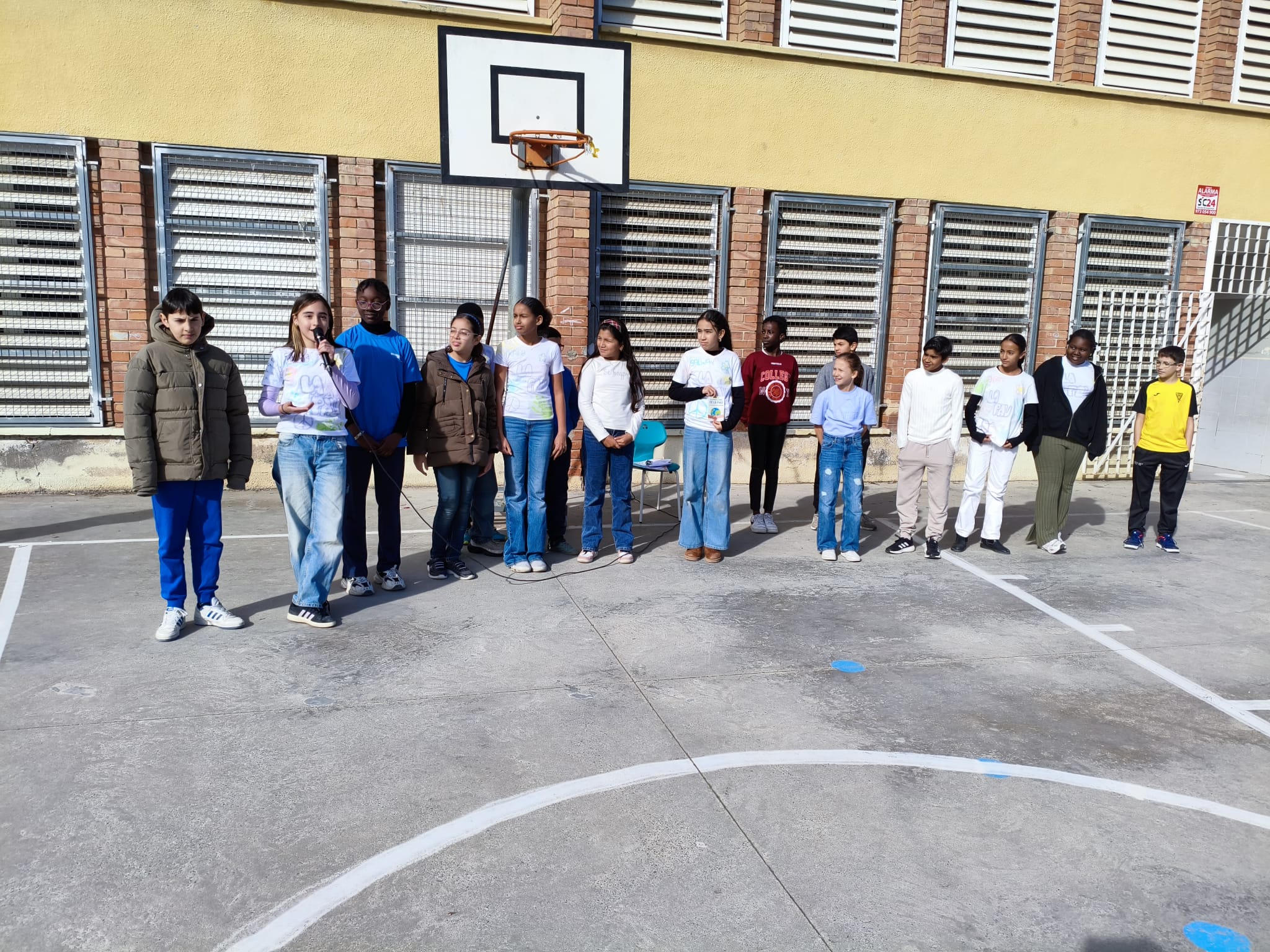 A migdia, abans d’anar a dinar, tota la comunitat escolar vam baixar al pati, es va llegir un manifest i vam cantar una cançó per la pau. Va ser una jornada molt bonica on vam demanar “PAU” en tots els racons del món, a casa  i a l’escola!!