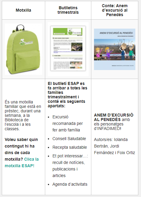 L’objectiu és fomentar hàbits saludables: alimentació saludables, vida activa, promoció de l’activitat física…a través d’ activitats a l’escola i recomanacions als infants i a les famílies.