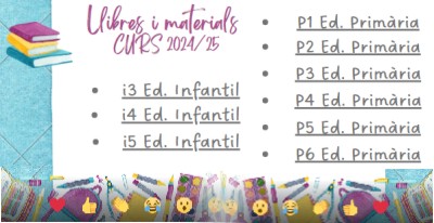 LLIBRES I MATERIAL CURS 24-25Per pfangles / 14 de juny de 2024 / Portada Cliqueu AQUÍ per entrar a consultar les llistes del curs que us convingui.
