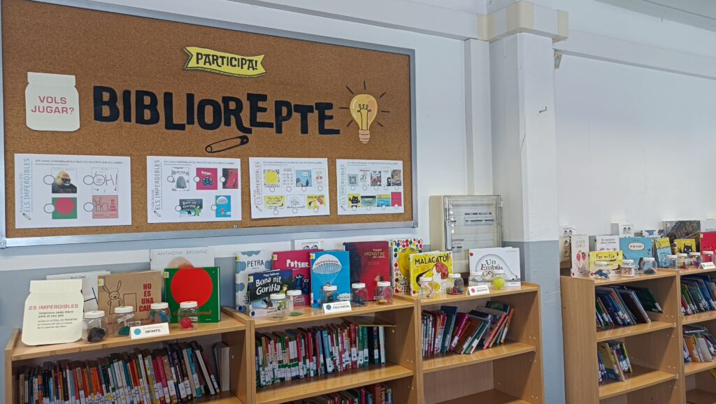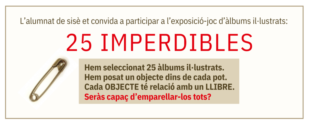 En el marc del foment lector i la dinamització de la biblioteca escolar, l’alumnat de 6è ha creat una exposició-joc d’àlbums il·lustrats amb un repte molt especial: emparellar cadascún dels 25 llibres de l’exposició amb el seu objecte corresponent amagat dins d’un pot. L’objectiu? Implicar al claustre en una activitat lúdica que connecti amb el gust per la lectura a partir d’una proposta que prové dels propis alumnes. Per això, tots els mestres han rebut una carta personalitzada animant-los a participar en aquest bibliorepte. D’aquesta manera teixim complicitats entre mestres i alumnes i promovem activiats que no només van dirigides a l’alumnat sinó també a tot l’equip docent de l’escola.