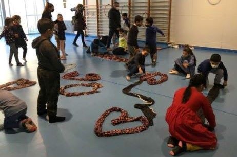 Hem treballat el moviment del nostre cos imaginant-nos diferents escenes com la lluna, flotant, amb consciència de cada pas i cada moviment. També hem gaudit d’altres activitats amb mocadors, on hem construït un mural comú.