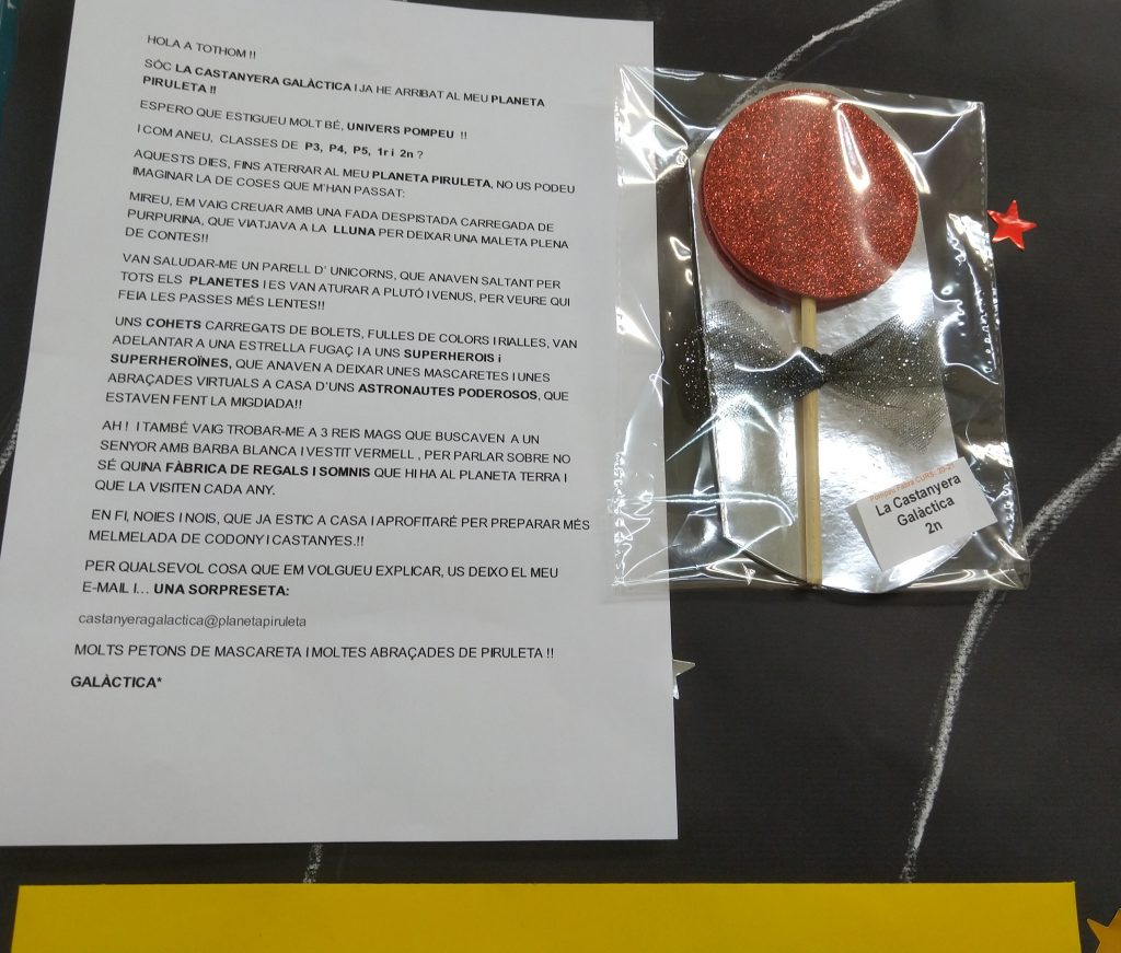 DESPRÉS DE FER-NOS UNA VISITA VIRTUAL EL DIA DE LA CASTANYADA, ARA ENS HA ESCRIT UNA CARTA I ENS HA REGALAT UNA PRECIOSA PIRULETA DEL SEU PLANETA PIRULETA.