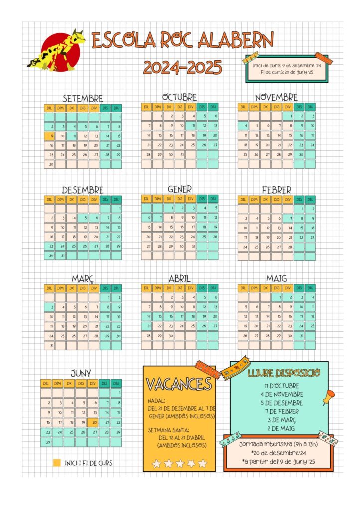 Calendari del curs CALENDARI ESCOLAR Segons la normativa fixada pel Departament d’Ensenyament i aprovat pel Consell Escolar de l’escola.