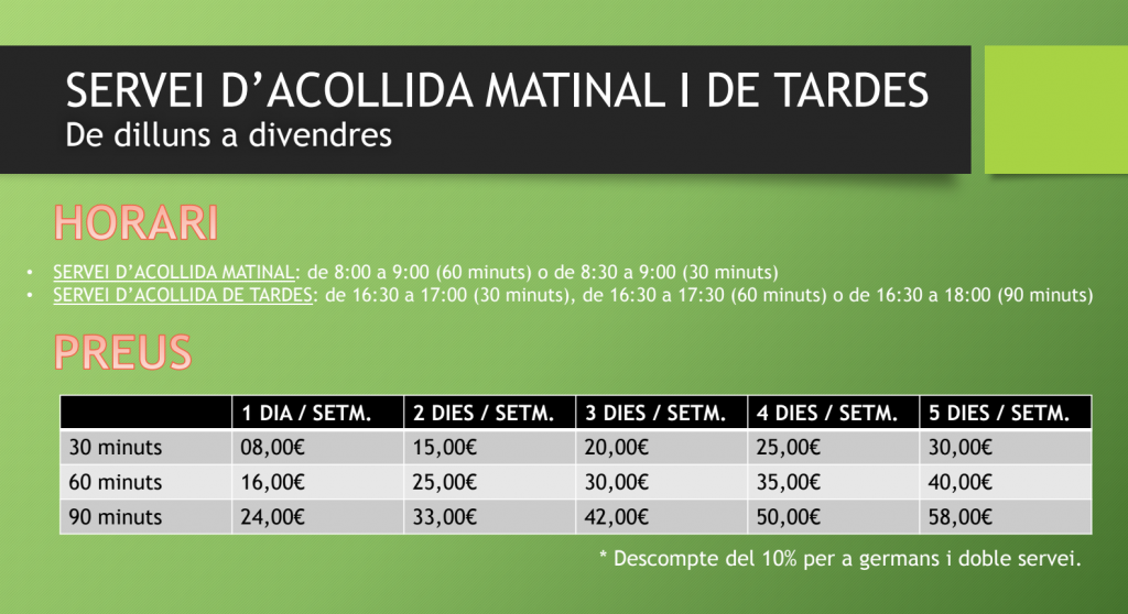 Podeu optar al servei d’acollida matinal i de tarda a càrrec de l’Òliba blanca.