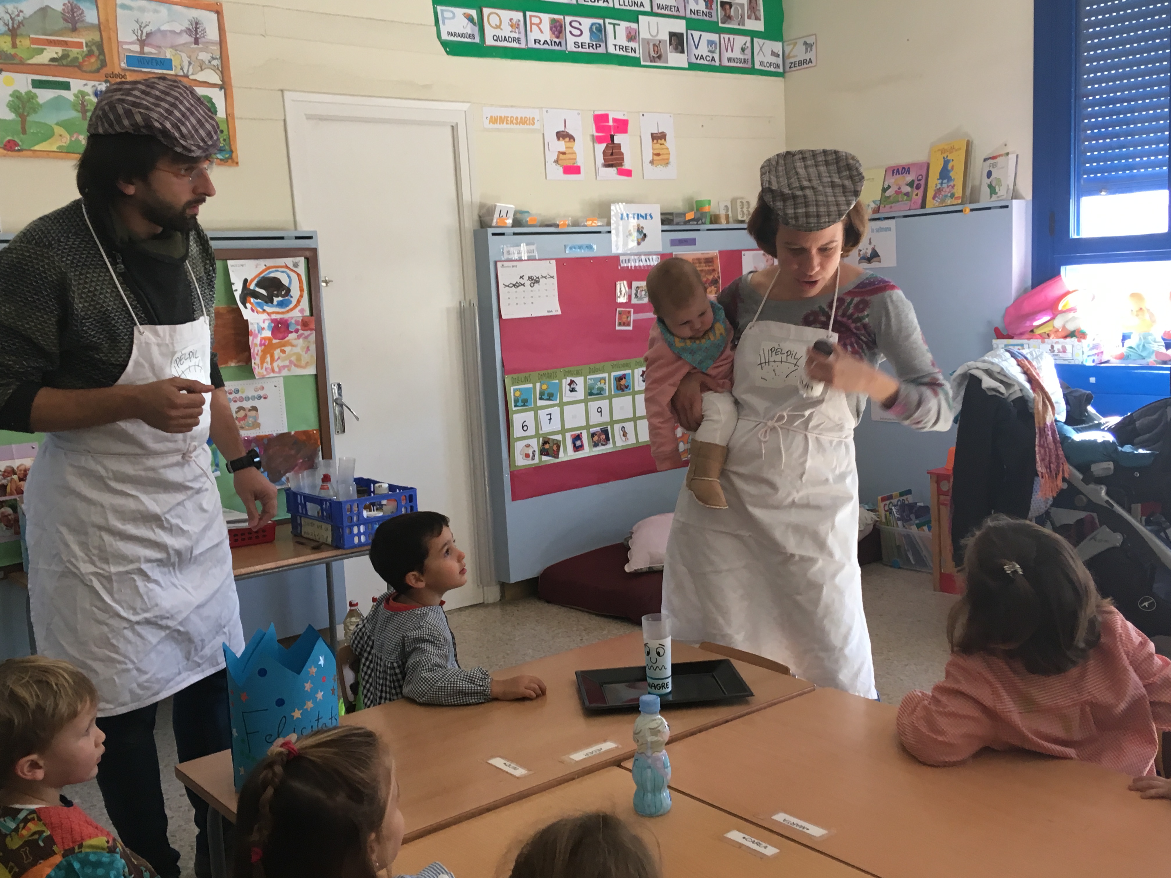 Dins de les activitats del foment de l’expressió oral que ens hem proposat a Infantil, els pares i mares estan convidats a portar-nos experiments a l’aula. Avui han vingut els pares del Quim per demanar-nos ajuda pel Senyor Vinagre, que estava trist per no tenir cabell.