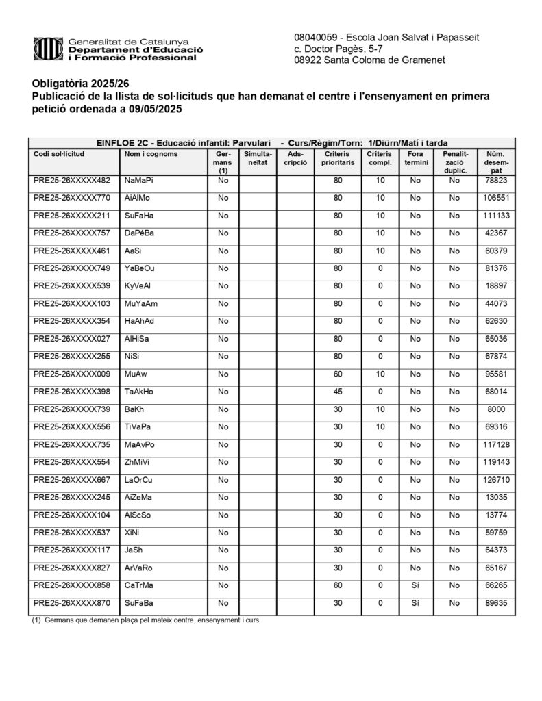 Obligatòria 2025/26 Publicació de la llista de sol·licituds que han demanat el centre i l’ensenyament en primera petició ordenada a 09/05/2025 Feu un comentari / Per CARMEN CANO / 9 de maig de 2025 / General Portada