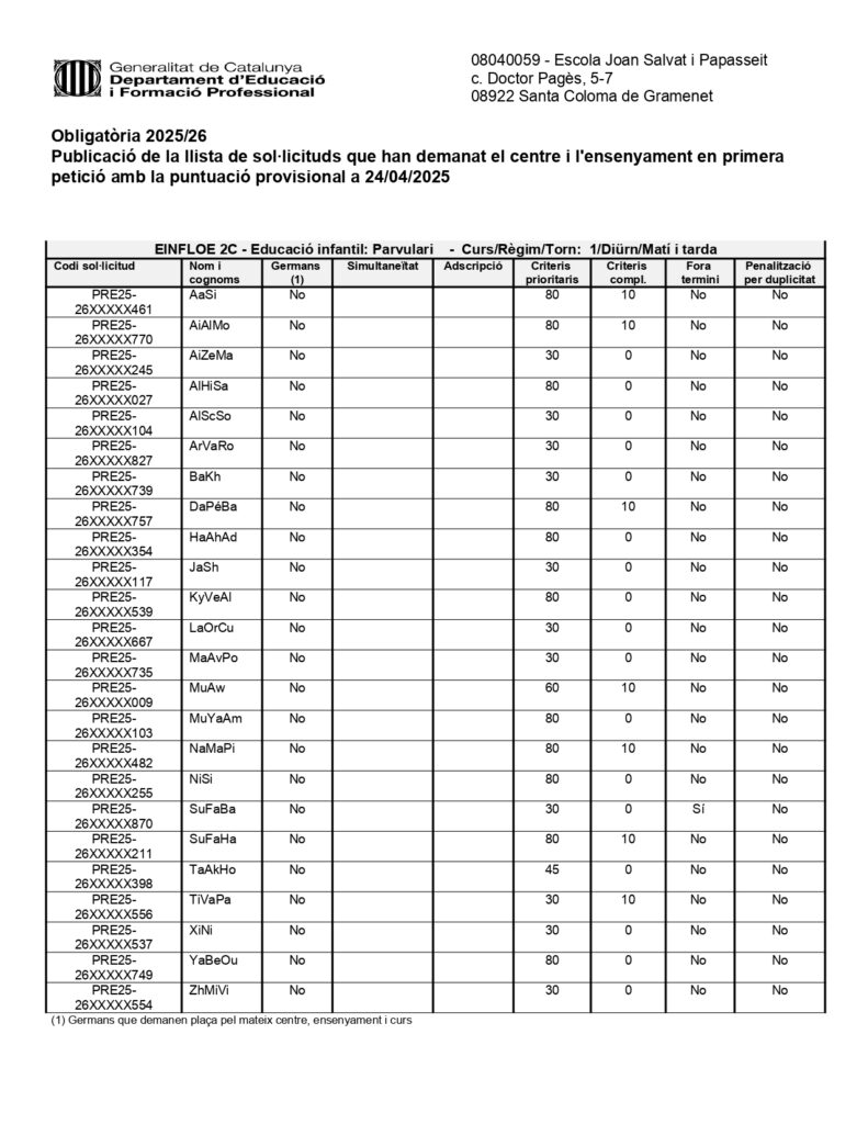 Publicació de la llista de sol·licituds que han demanat el centre i l’ensenyament en primera petició amb la puntuació provisional Feu un comentari / Per CARMEN CANO / 24 d'abril de 2025 / General Portada