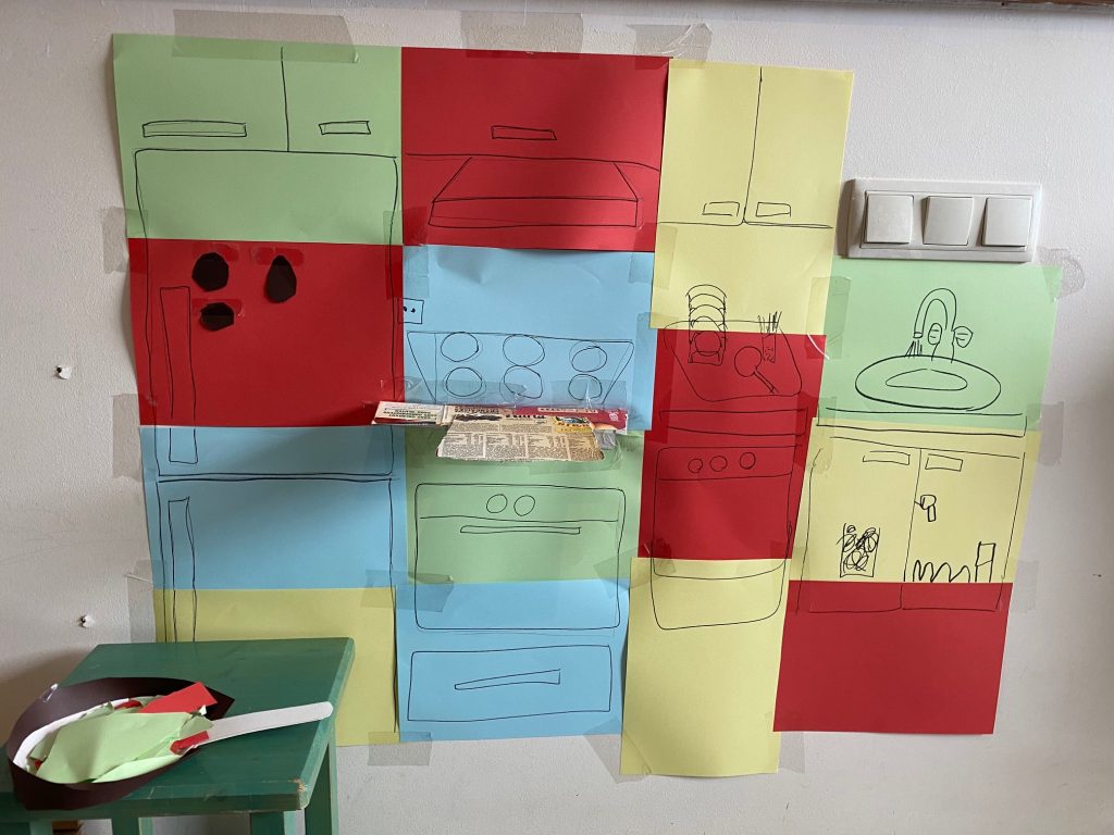 El Joan va tenir la fabulosa idea de fer una cuineta de cartró com la que surt al llibre del Mic, i com que no teníem prou cartró vam decidir fer-la enganxant cartolines de colors a la paret i dibuixant tot allò que hi ha a una cuina.