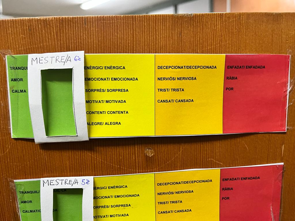 Els termòmetres estan situats a l’entrada de la classe. Cada dia, quan arribem marquem on ens trobem exactament. Així els mestres i companys poden saber com estem aquell dia i posar-se en el nostre lloc.