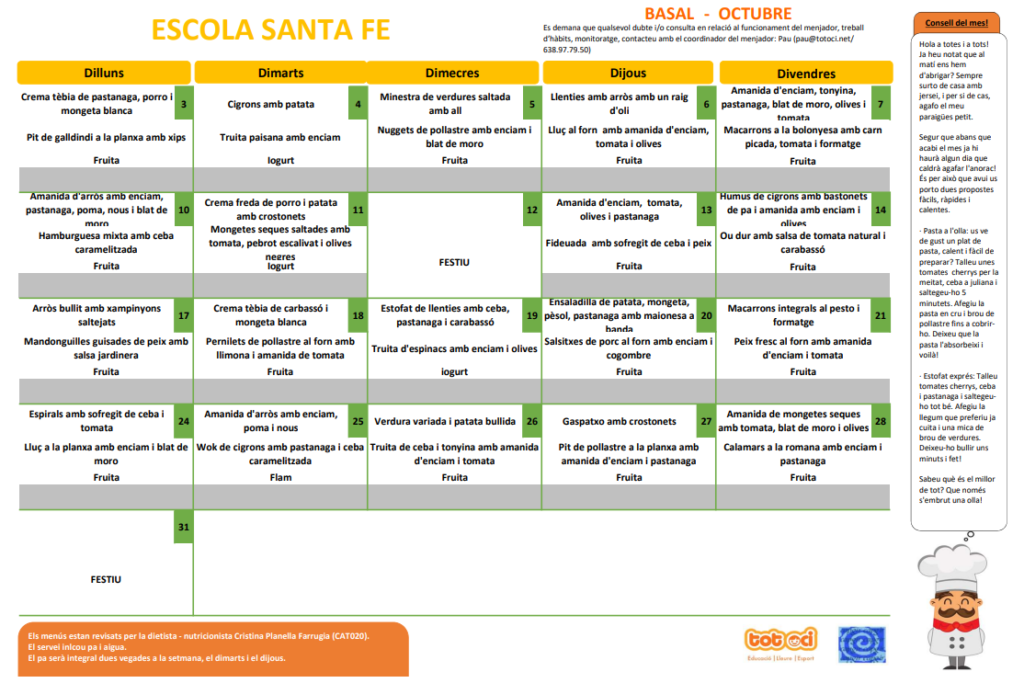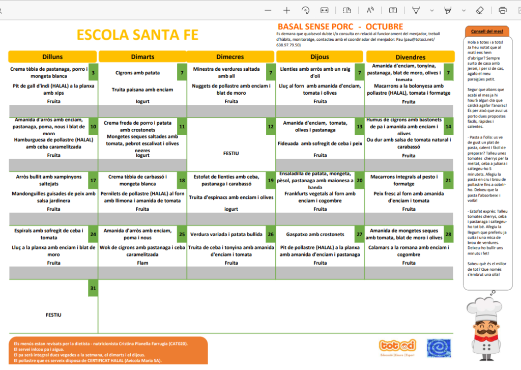 Bon dia, us hem canviat el menú de la pestanya menjador, aquí trobareu tota la informació referent al servei de menjador i el menú basal i el menú sense porc, que també us adjuntem aquí.