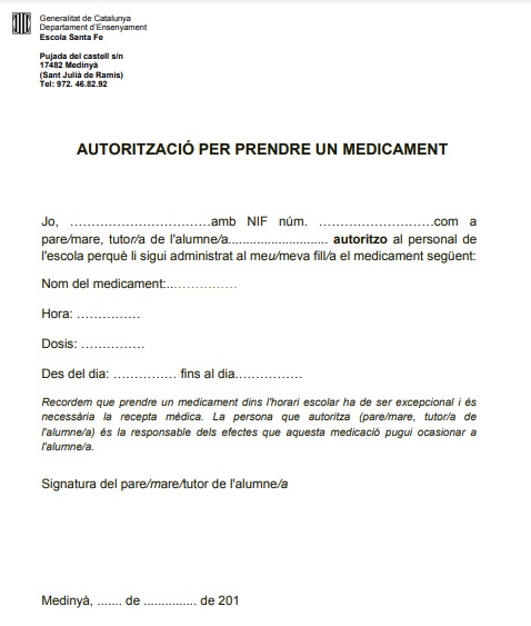 Quan el vostre fill/filla necessiti prendre algun medicament dins l’horari escolar, cal que porteu l’autorització per part del metge, així com la següent autorització: