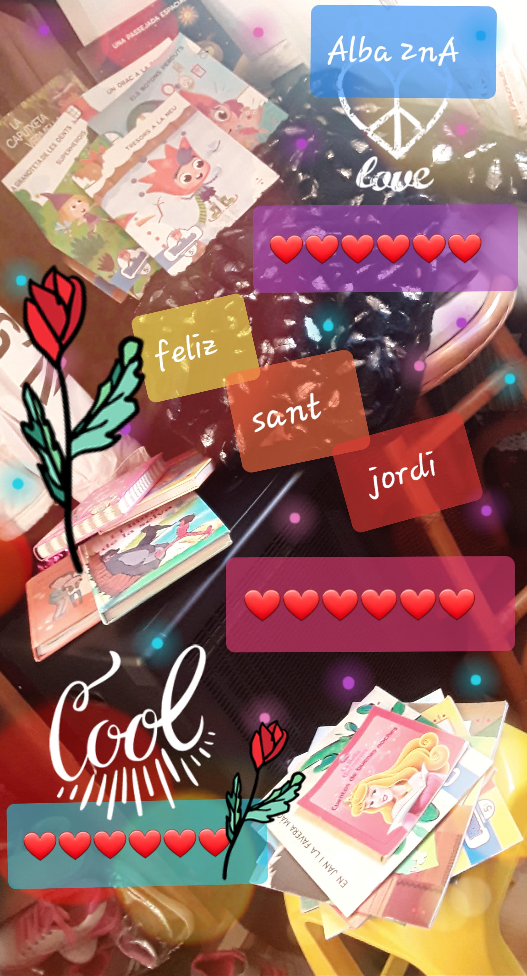 L’Alba (2n) també ens felicita el Sant Jordi amb una composició de llibres i flors virtuals molt bonica. Has fet una gran feina. Molt original!