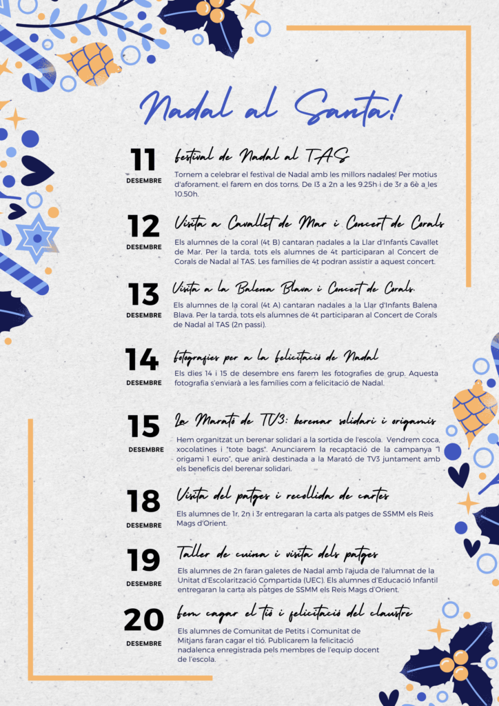 Adjuntem el programa d’activitats que portarem a terme de l’11 al 20 de desembre, per tal de celebrar el Nadal a l’escola.
