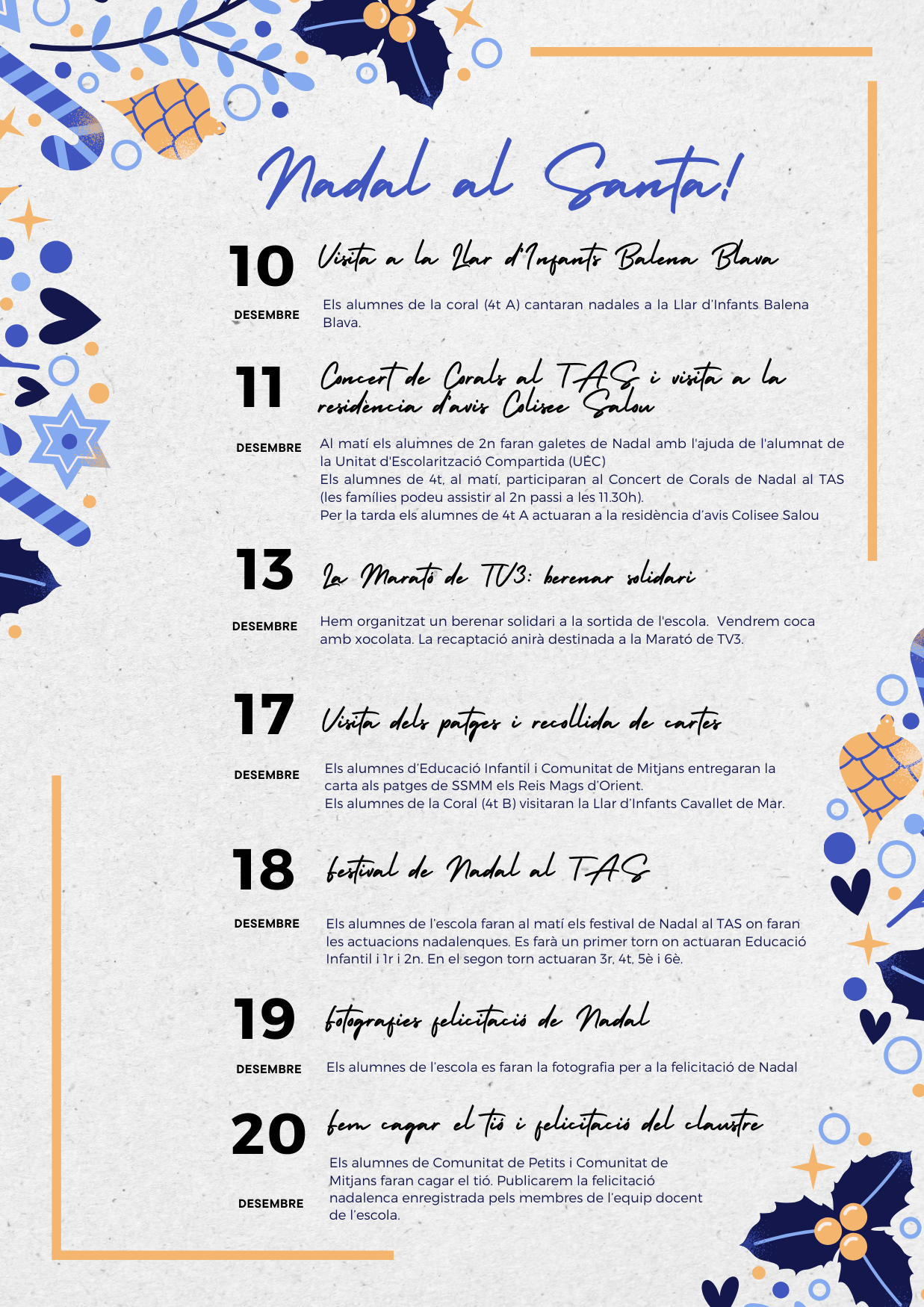 Adjuntem el programa d’activitats que portarem a terme per tal de celebrar el Nadal a l’escola.