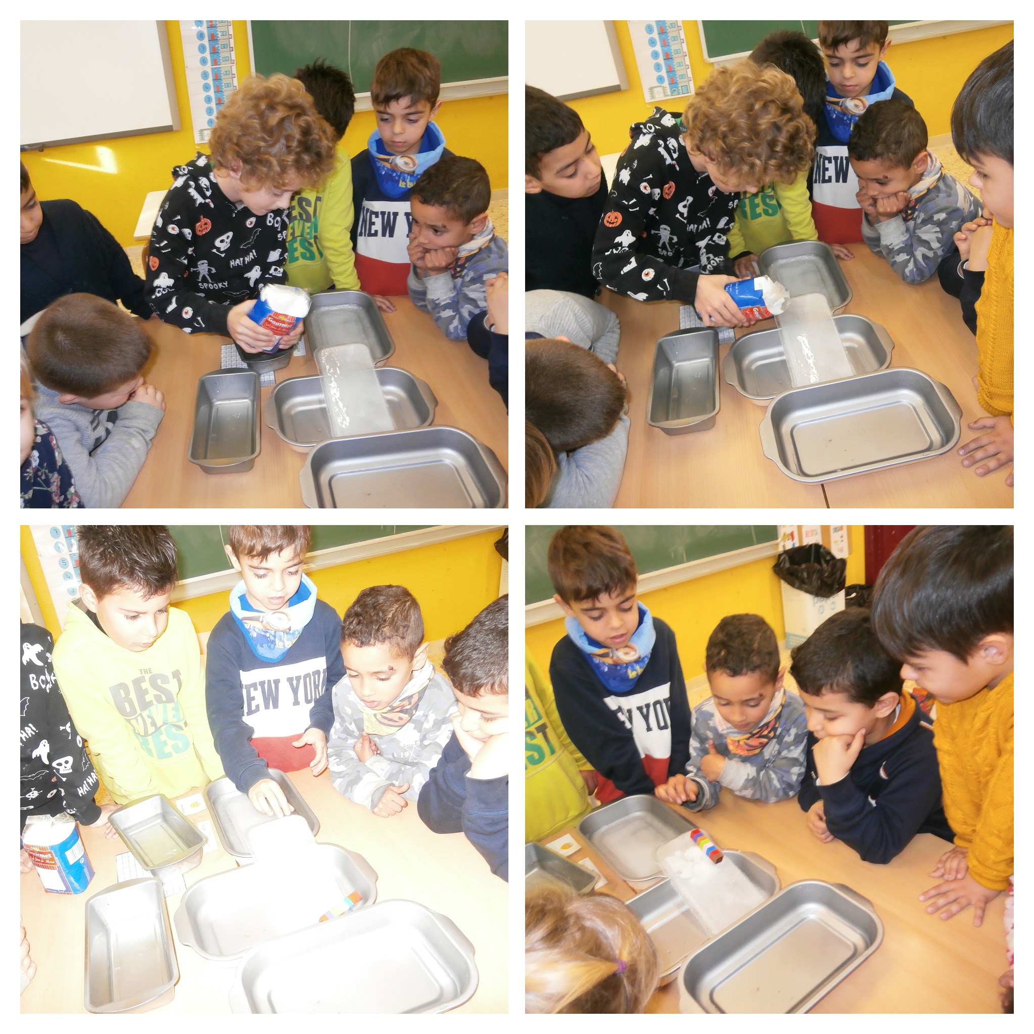 Els alumnes de 1r, manipulant aigua i sal, hem descobert que la sal desfà el gel. D’aquesta manera hem entès el funcionament i la importància de les màquines que tiren sal a la carretera quan gela o neva.
