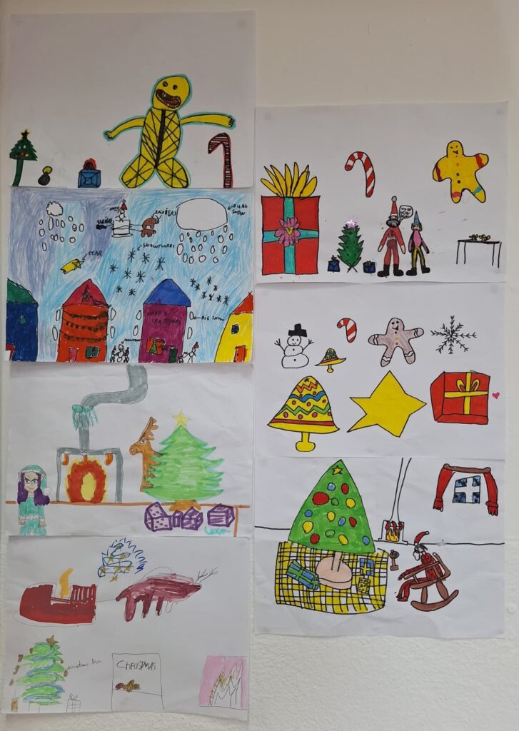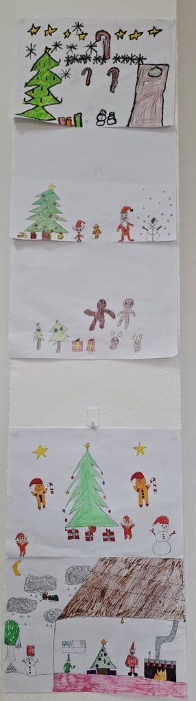 Aquests últims dies, abans de les vacances de Nadal, hem creat dibuixos per representar situacions nadalenques on sortissin les paraules de vocabulari treballades. Després, hem fet un text per descriure el dibuix utilitzant les estructures “there is / there are”. Finalment, ens hem estudiat el text i hem presentat el dibuix oralment a la resta de companys/es.
