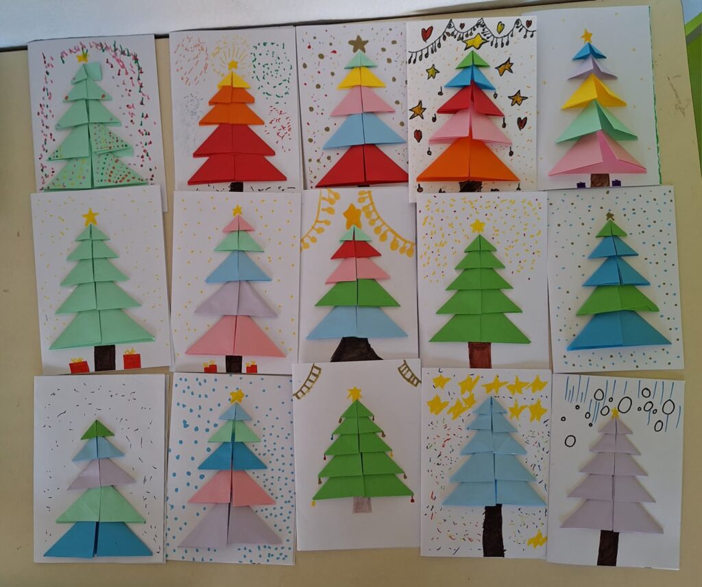 A l’hora de plàstica vam crear la portada de la postal de Nadal fent papiroflèxia amb quadrats de papers de colors de diferents mides.