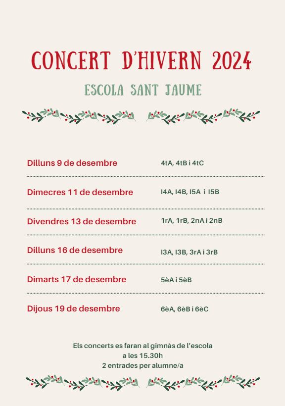 Adjuntem la relació de les diferents dates dels Concerts d’hivern 2024 que es faran a l’escola com cada any.