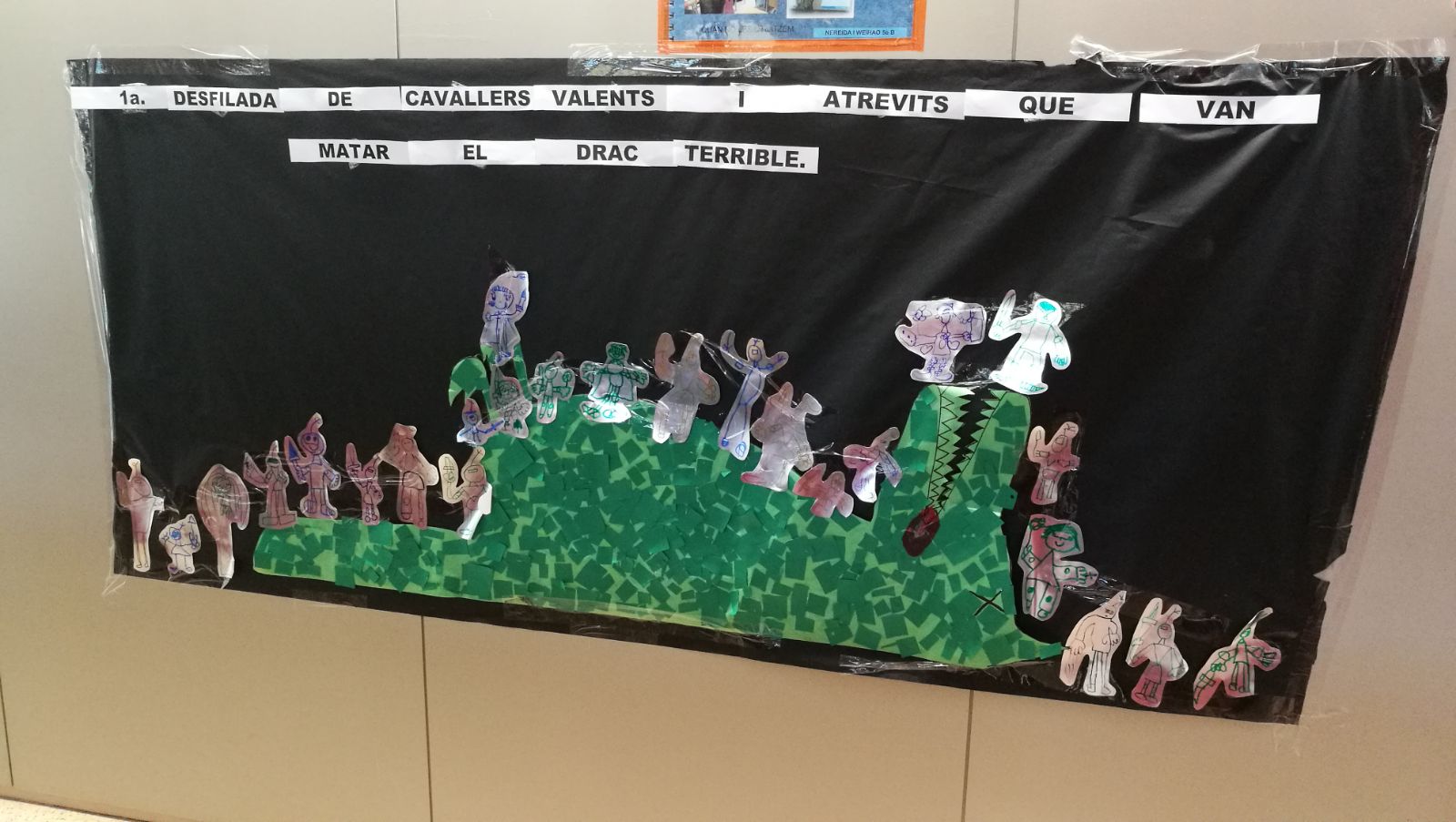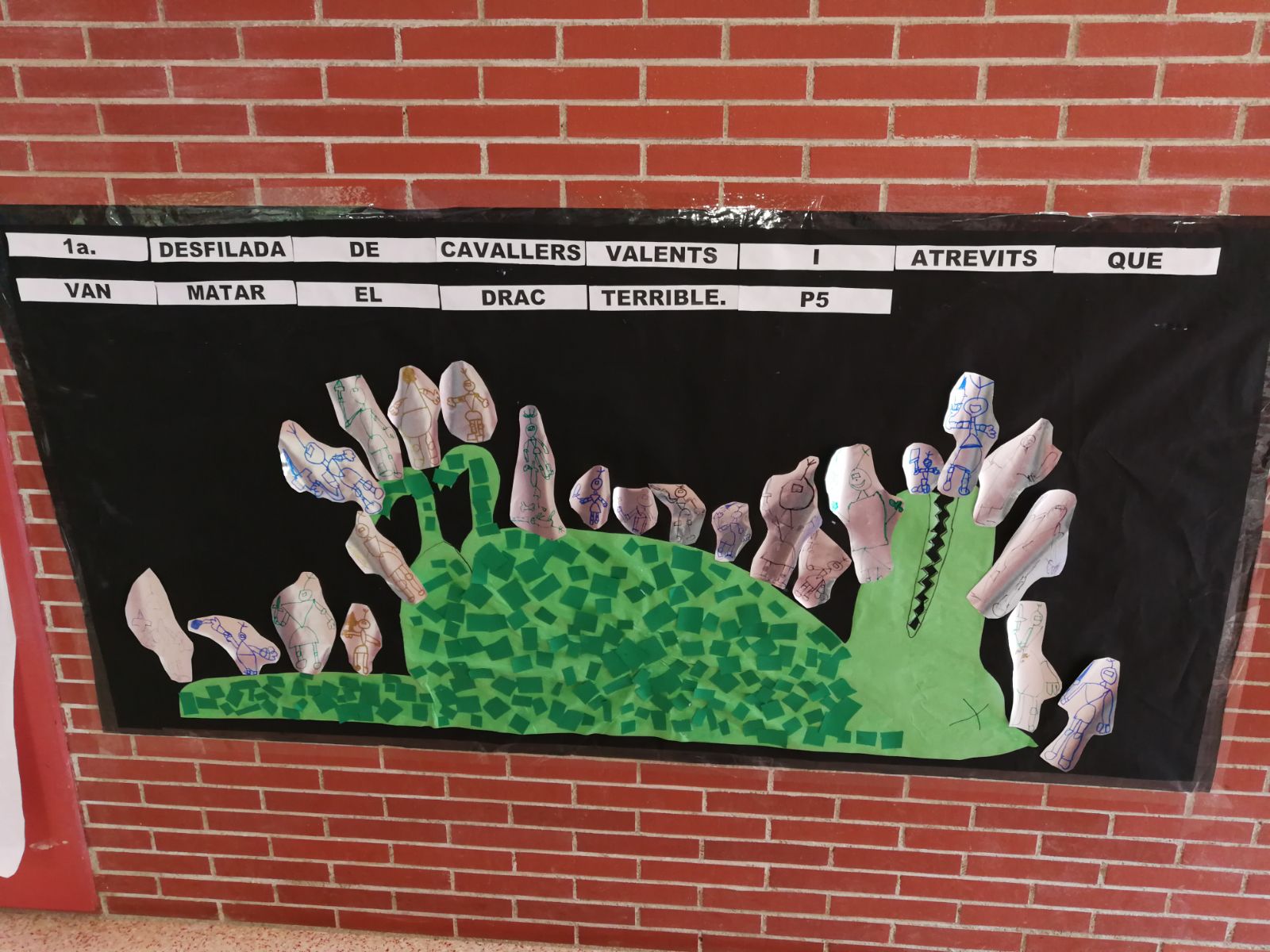 Aquest curs hem volgut allunyar-nos una mica dels típics murals de Sant Jordi i acollir la petició de tots els alumnes de les classes de P5 i fer-hi sortit el cavaller ben lluent i armat que ha fet cadascú.