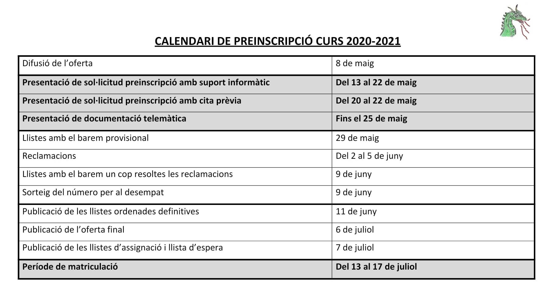 Aquest és el calendari de preinscripció i matricula de l’escola. Tots els tràmits es podran fer telemàticament.