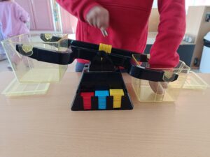 A ciència hem fet dues activitats diferents. Per una banda, hem experimentat amb imants i hem pogut veure amb quins materials s’atrauen i amb quins no i fer diferents prediccions. Per altra banda, hem vist diferents tipus de balances i hem pesat objectes de l’aula tot fent estimació de què pesa més i què pesa menys.