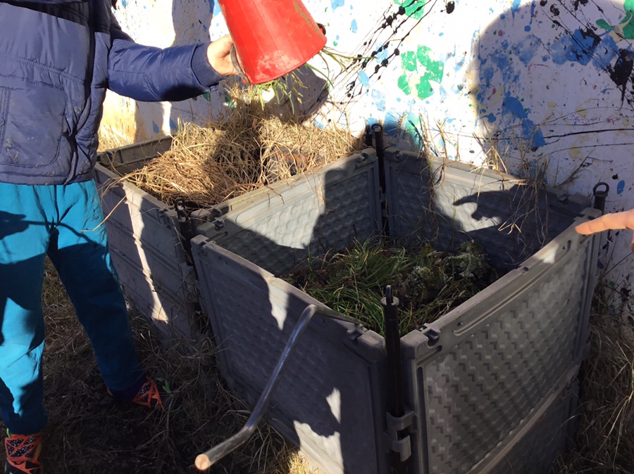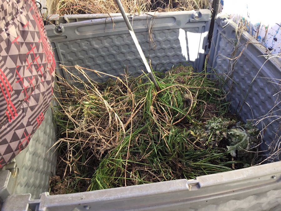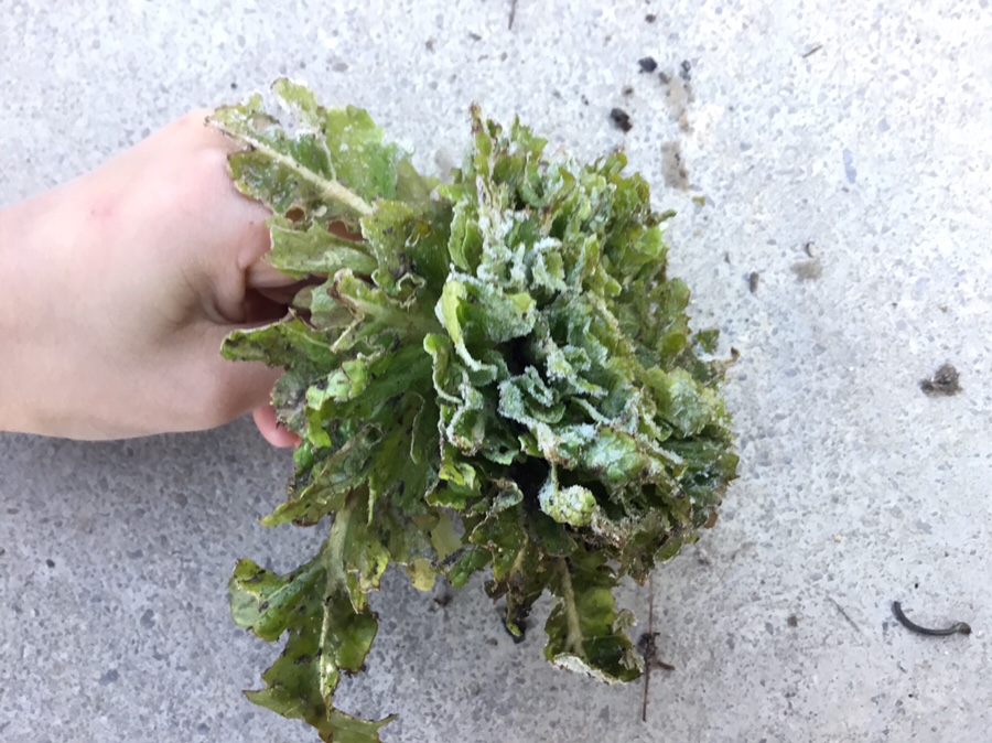 We went the compost hip to put the dead plantsWere picking up the spinach and the coliflower,because there dead.