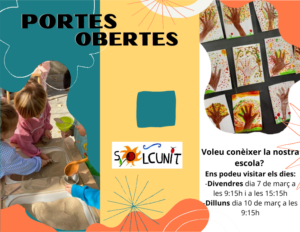 L’escola farà jornada de portes obertes els dies 7 i 10 de març. El dia 7 de març farem dos torns de visita, a les 9:15h i a les 15:15h; i el dia 10 farem un torn de visita, a les 9:15h.