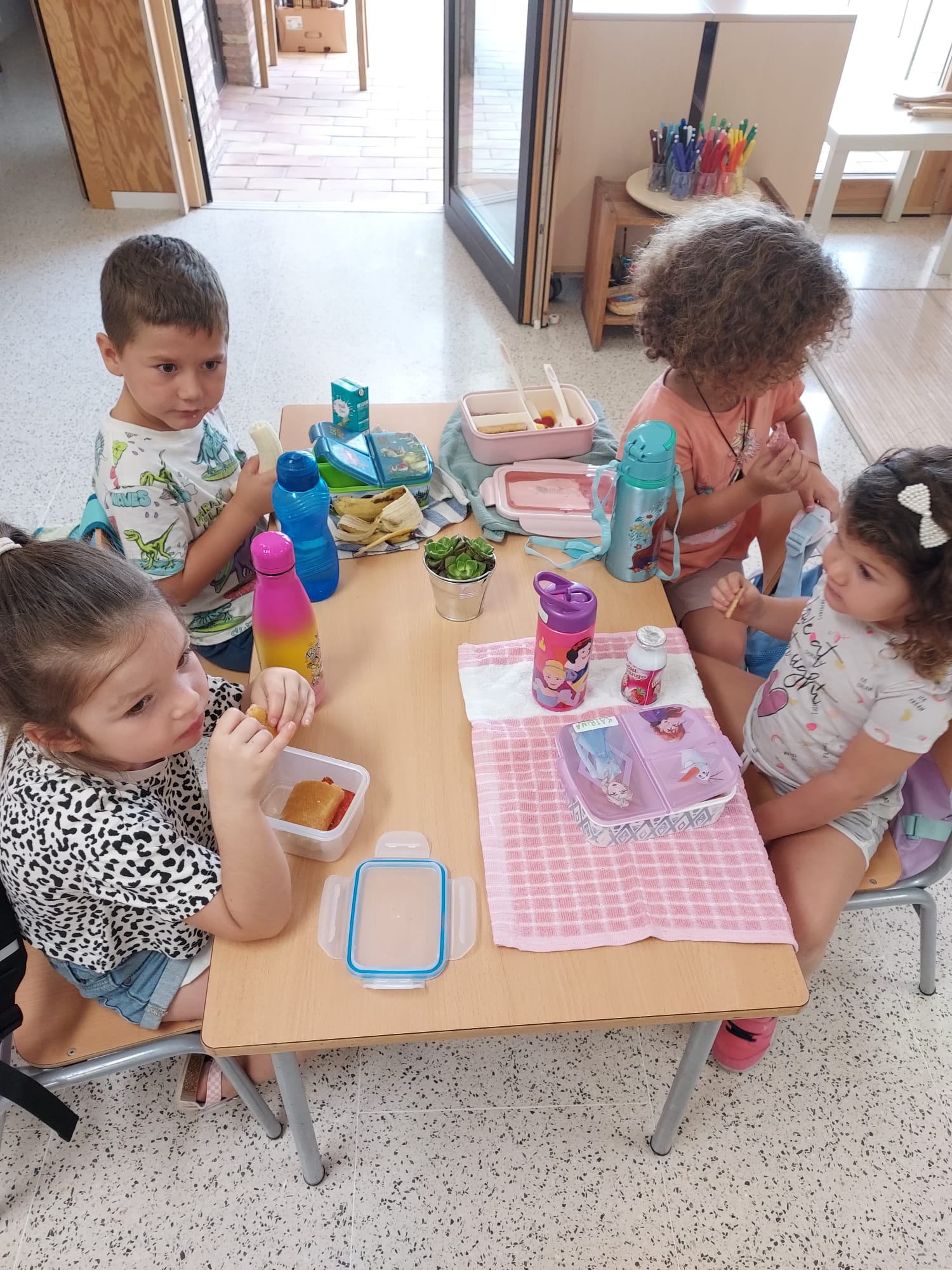 Després de viure uns dies amb l’acompanyament de les famílies dins l’aula, els infants que s’han incorporat a l’escola han donat senyals que ja se senten segurs i segures en aquest nou espai i, per això, hem començat a donar pas a l’inici de les estructures pedagògiques. Encara queden uns dies per començar el treball per ambients o el taller de consciència fonològica agrupats per edat, però ja hem començat les sessions de psicomotricitat, les d’anglès, les sessions de música, les sortides i els teixits de grup. Sobretot, hem centrat els primers dies a viure propostes que permetin començar a forjar nous vincles, a adquirir nous hàbits i rutines i a preparar la nostra nova aula.