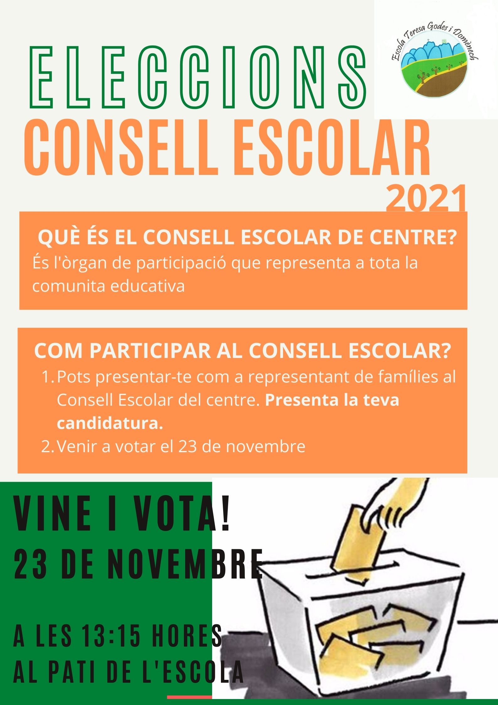 - Votació el 23 de novembre de 13h15 a 14h15 al pati de l’escola