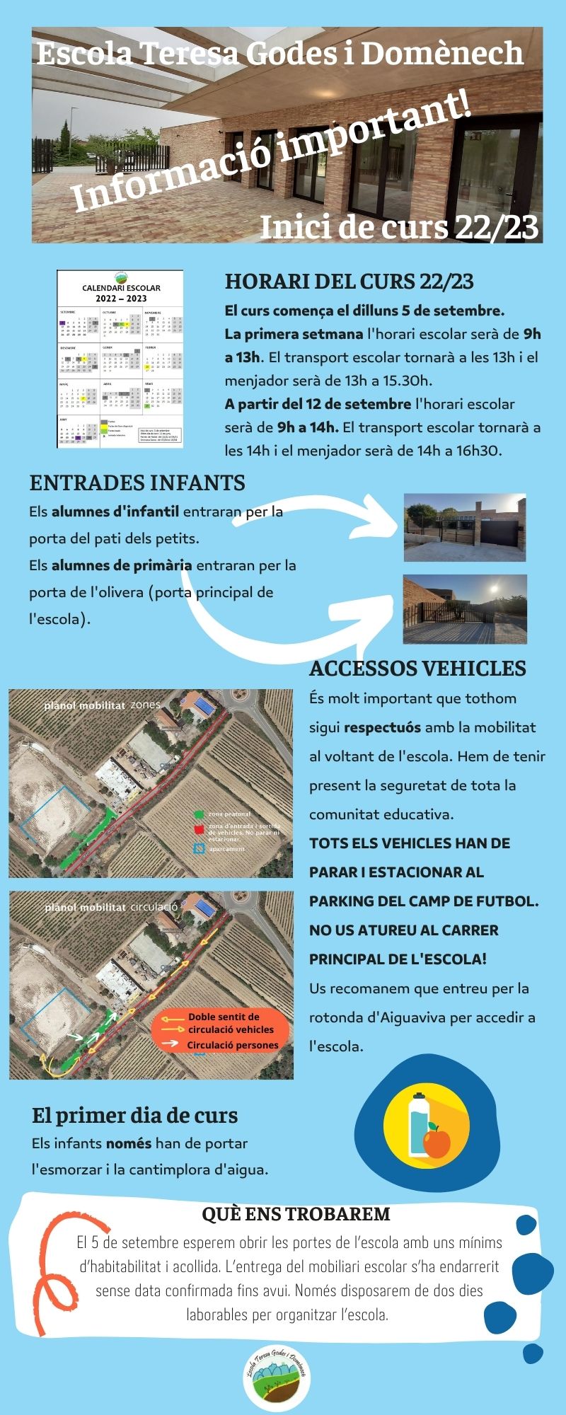 us enviem una infografia amb la informació bàsica per iniciar el curs 22/23. Fins aquesta setmana no hem sabut l’horari definitiu que farem al mes de setembre, per això aquest endarreriment en comunicar-vos-ho. Us preguem que el mireu i que si teniu qualsevol dubte ens ho feu saber.
