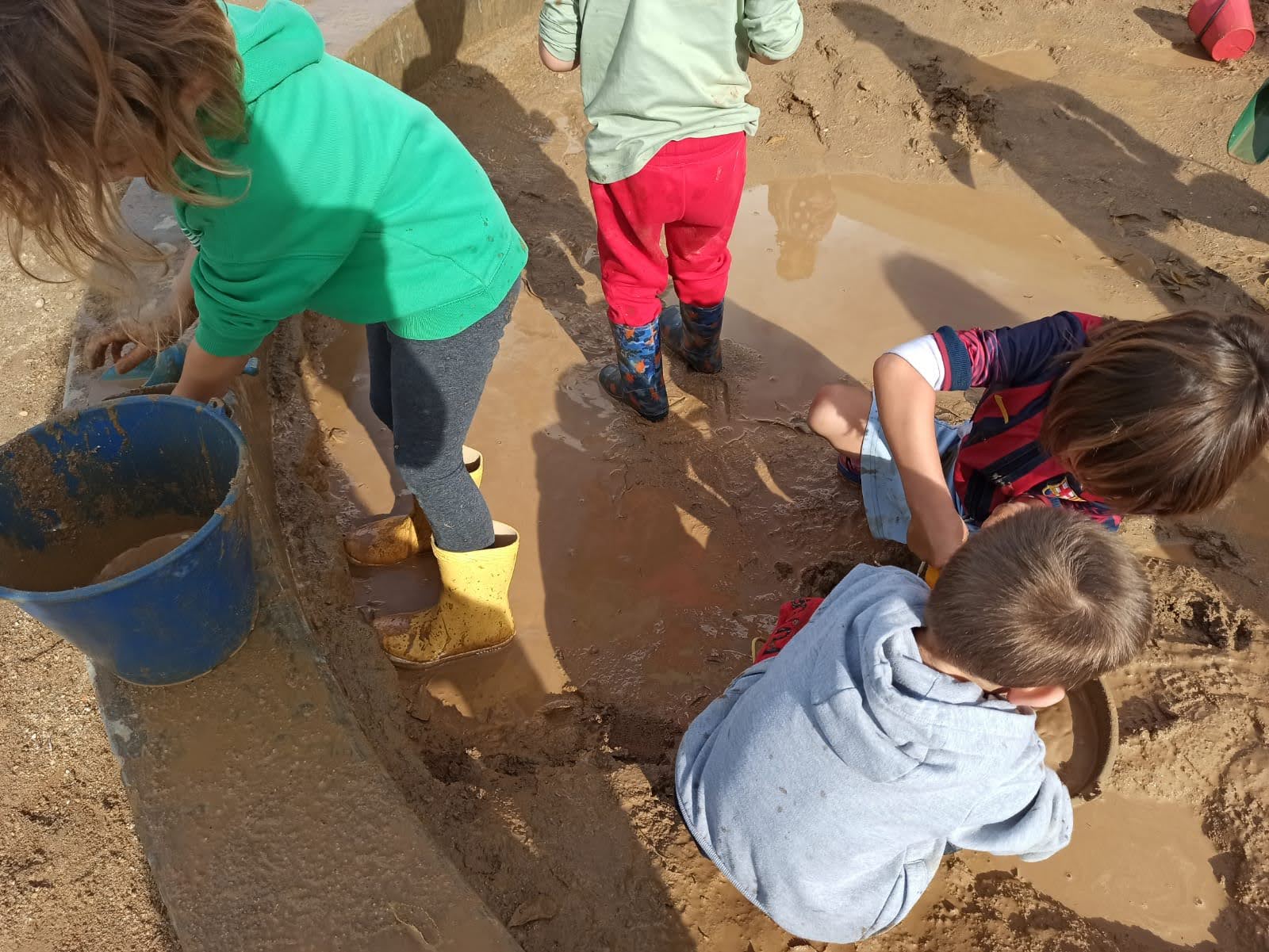 Els infants interaccionen amb l’aigua i la terra, manipulant amb les mans aquesta sensació freda, travessant aigua en diferents recipients, caminant i saltant per sobre els tolls, etc.