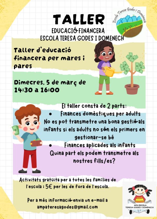 Des de l’AFA de l’escola ofereixen un taller sobre educació financera per a infants, adreçat a famílies.