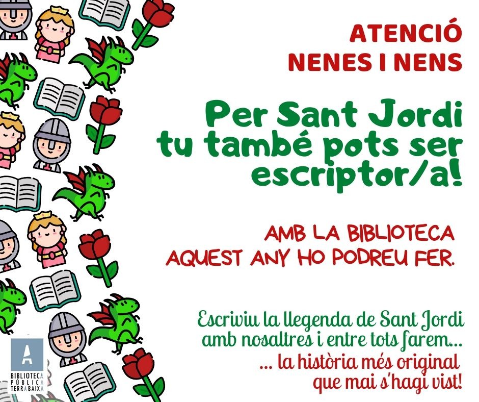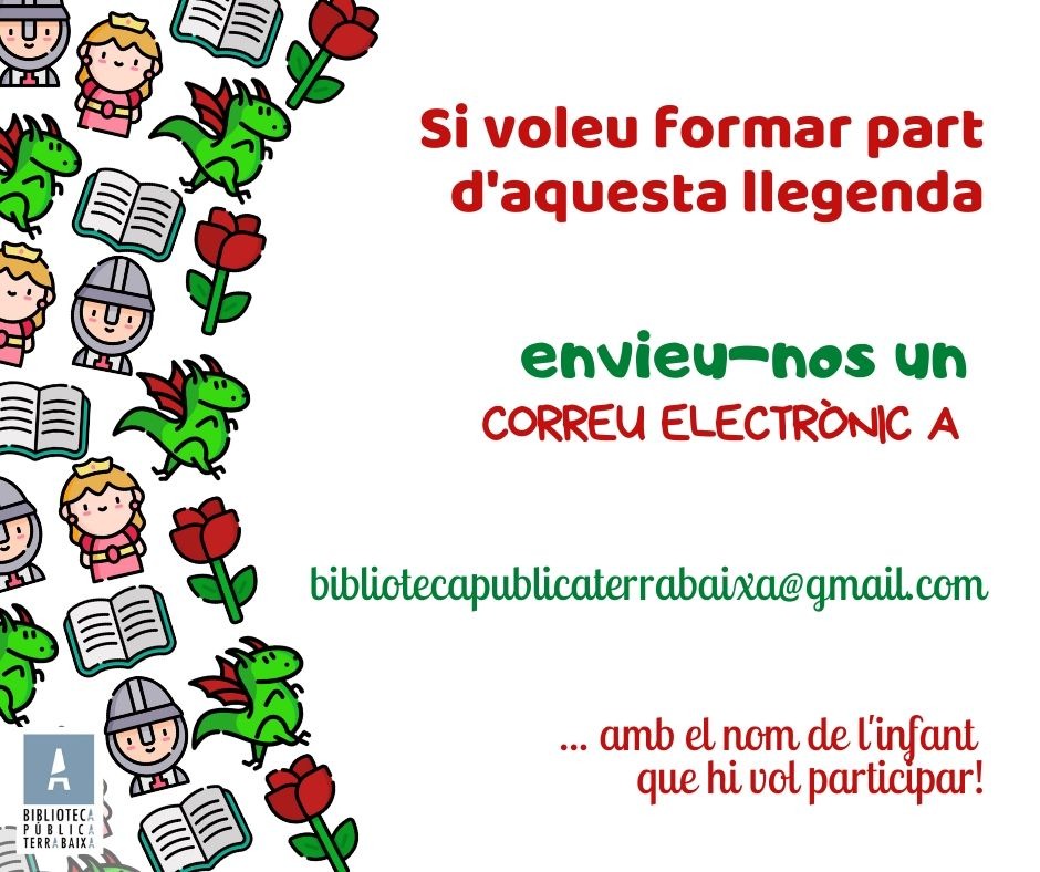 Voleu formar part d’una gran llegenda de Sant Jordi? Si és així, des de la comissió de biblioteca us animem a participar a l’activitat que realitza la biblioteca pública Terra Baixa de El Vendrell. Escriu la teva llegenda i envia-la a bibliotecapublicaterrabaixa@gmail.com, amb el teu nom i formaràs part d’aquesta gran llegenda.