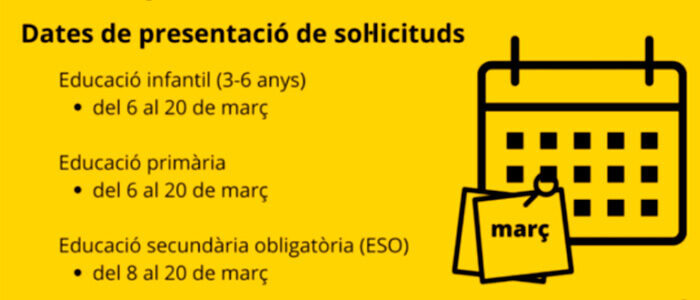 Presenta la sol·licitud de preinscripció PRESENTACIÓ DE SOL·LICITUDS INFANTIL I PRIMÀRIA: Del 6 al 20 de març de 2023 (a partir de les 9 hores) SECUNDÀRIA: Del 8 al 20 de març de 2023 (a partir de les 9 hores) Preguntes freqüents Com puc fer la preinscripció? Enllaç explicatiu de com fer la preinscripció: INFANTIL