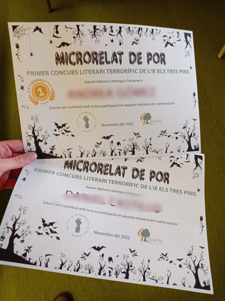 Després d’una difícil deliberació del jurat atesa la qualitat dels relats, les alumnes A.G. i L.B. han estat les persones premiades amb dues entrades per al Casal Municipal de Vallromanes. A més, també s’ha fet entrega de diplomes de participació a tot l’alumnat que va prendre part del I Concurs literari terrorífic de l’IE Els Tres Pins, premiant així el seu esforç i valorant positivament la seva implicació en les activitats del centre.