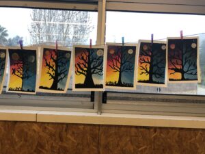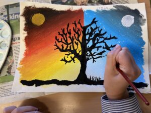 u una imatge de la posta de sol i una de la nit, i mig un arbre. Aquesta proposta és el resum del que hem treballat a classe: la degradació , els colors primaris i els secundaris, els colors complementaris, les tonalitats, el cercle cromàtic…