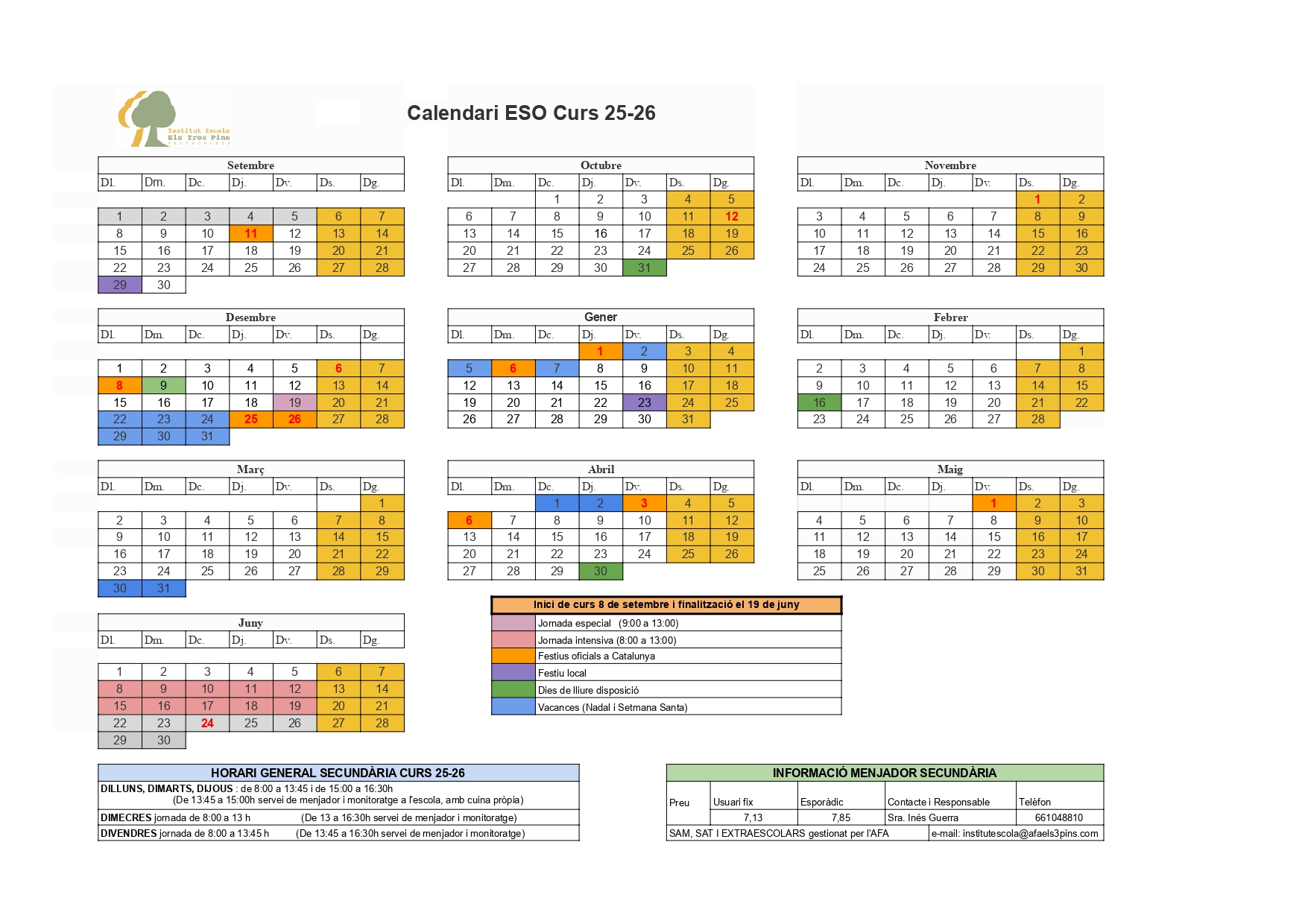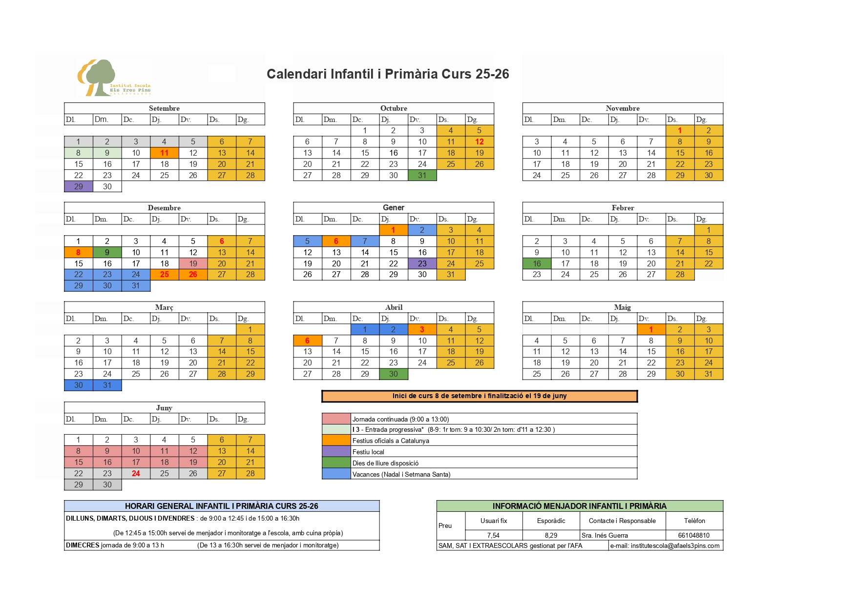 Infantil i Primària (jornada continuada de 09:00 a 13:00) i Secundària (jornada continuada de 08:00 a 13:00)
