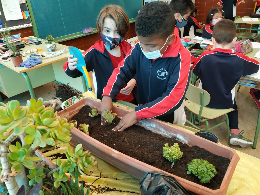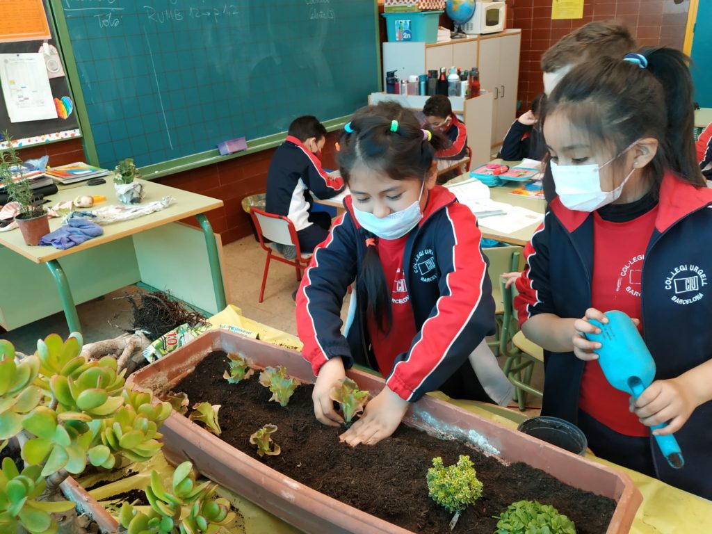 Tenim la sort d’estar en una aula que dona al pati interior d’illa. A l’àmpit de les nostres finestres hi ha diverses jardineres. Fins ara hi havia plantes crasses, molt resistents al sol i a la falta de reg.