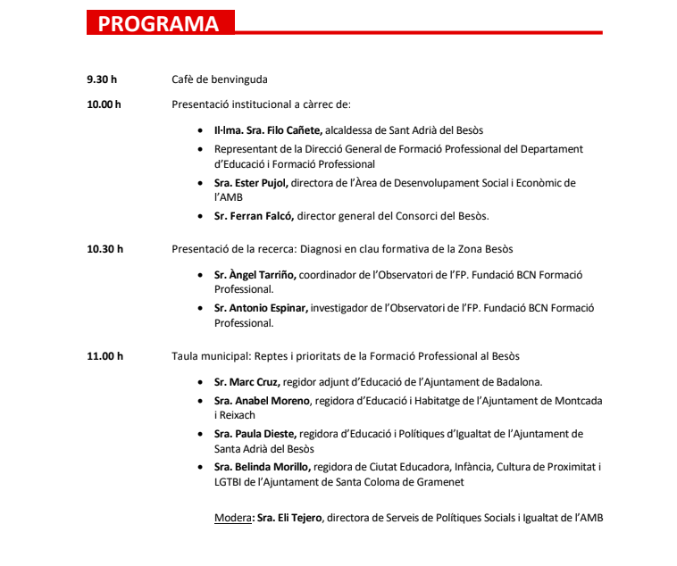 L’acte va concloure amb la voluntat expressa de consolidar una governança compartida de l’FP, basada en l’evidència i la participació dels agents clau del territori. El compromís de l’administració, a través de la presència del Sr. Ricard Coma Montoro, va posar de manifest la importància estratègica d’aquesta diagnosi com a punt de partida per a la planificació educativa i econòmica al Besòs.