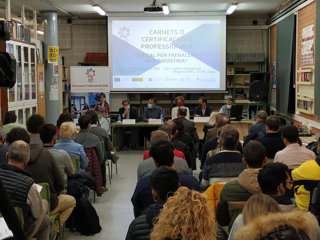 El passat dimarts 16 de novembre es va celebrar la jornada “Carnets o certificacions professionals. Què cal per treballar a la industria”, una sessió que es va dur a terme a l’Institut Guindàvols amb col·laboració dels Serveis Territorials d’Educació, d’Empresa i Treball i la Cambra de comerç de Lleida.
