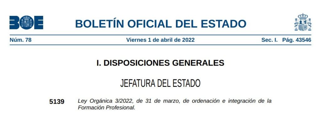 Avui s’ha publicat al BOE la Llei Orgánica 3/2022, de 31 de març, d’ordenació i integració de la Formació Professional.