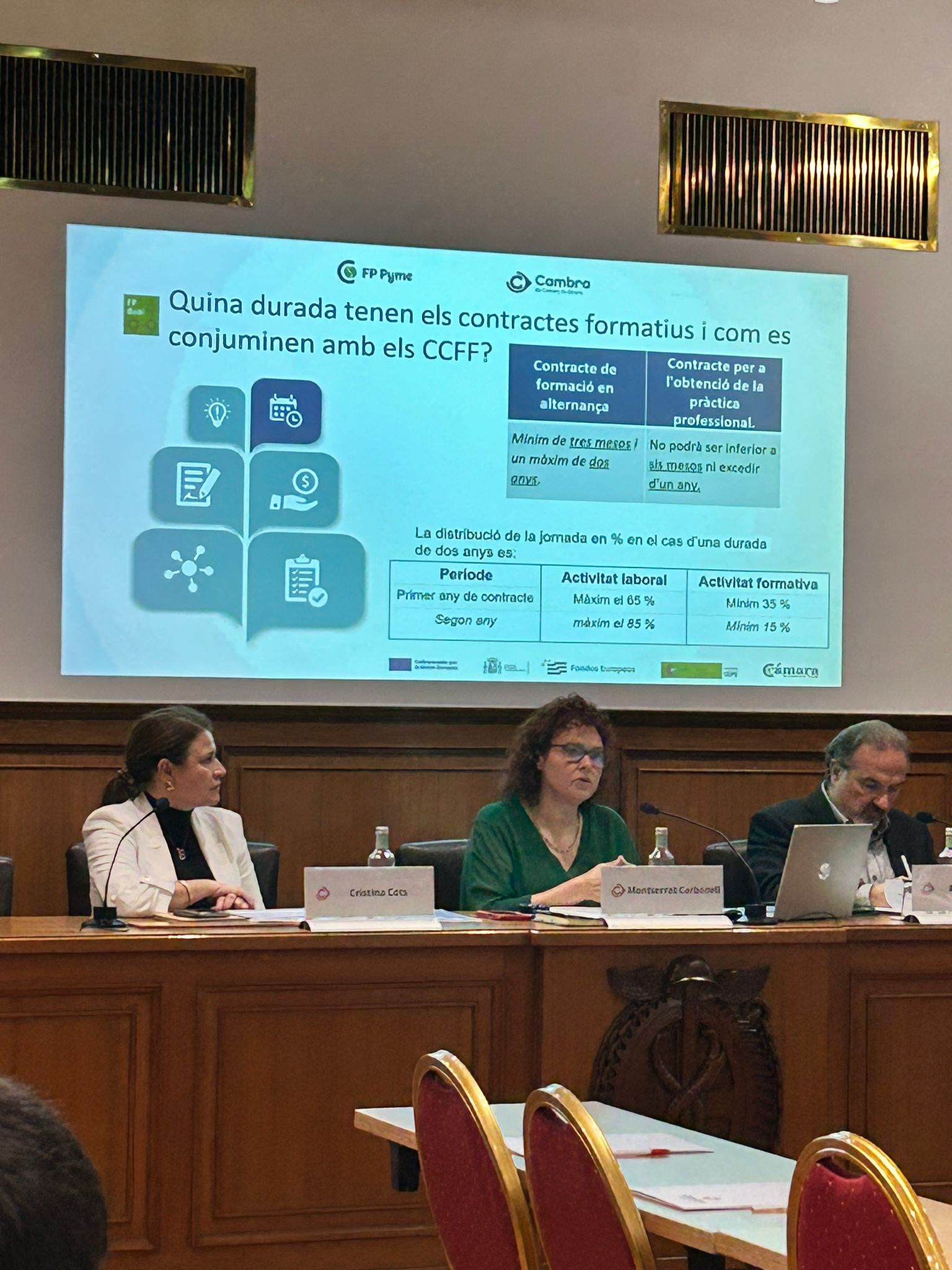 Amb el títol Taller FP PYME Nova llei de contractes formatius, la sessió es va iniciar amb una benvinguda i presentació per part de la Sra. Cristina Cots en nom de la Cambra de Girona, que va ser seguida per la ponència de la Sra. Montserrat Carbonell, assessora i prospectora d’FP del departament d’Educació i Formació Professional, sobre la nova llei de l’FP dual i modalitats de contractació, i com ajudar a les Pymes interessades en acollir estudiants d’FP en formació en l’empresa.