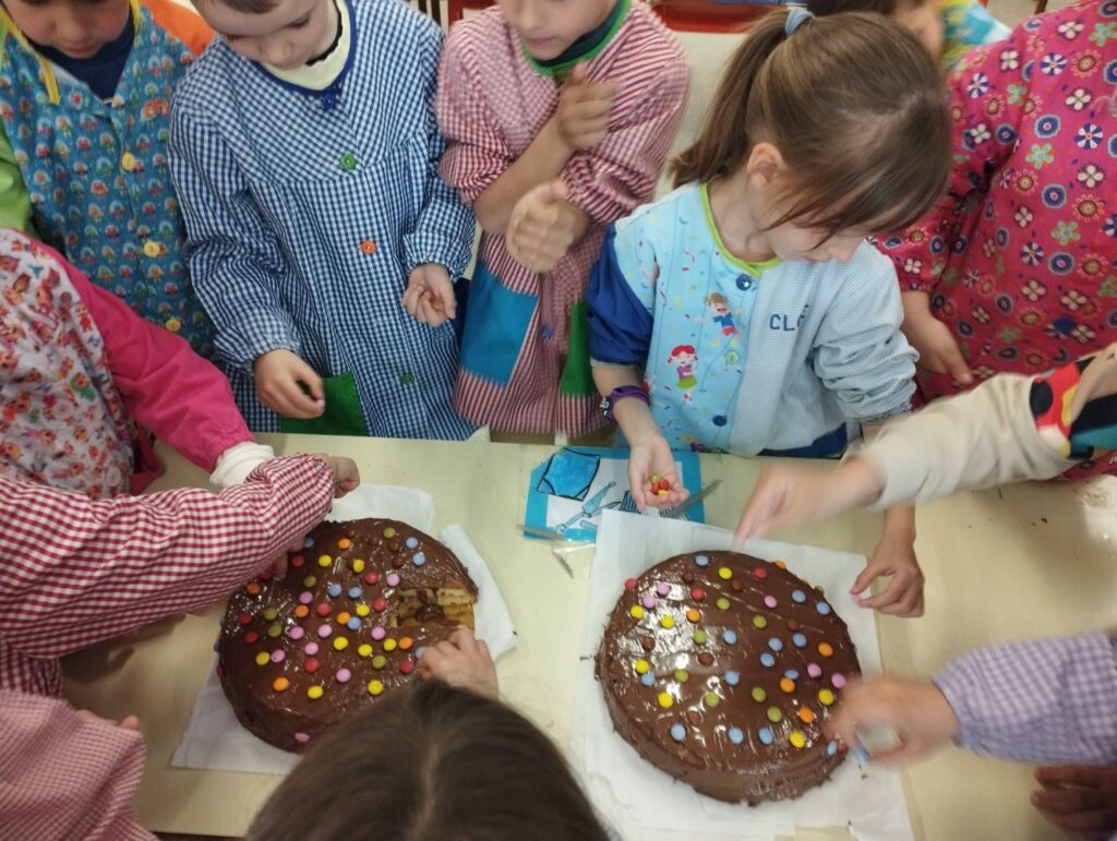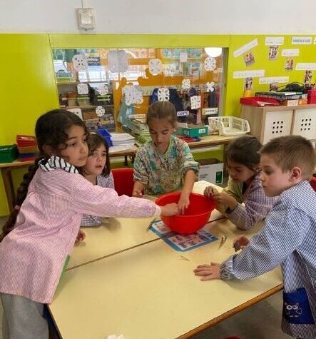 Avui, hem fet la mona a les classes de primer. Primer hem posat la melmelada de maduixa dins el pa