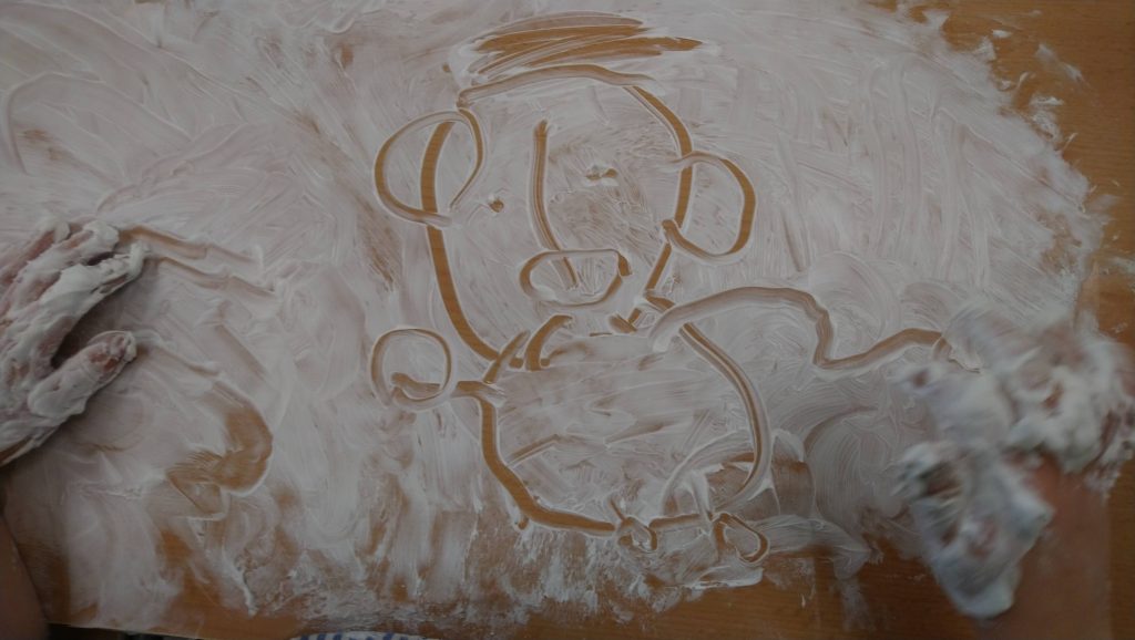 Avui per fer grafisme hem fet servir sorra fina de la platja amb safates. És molt divertit dibuixar amb sorra,