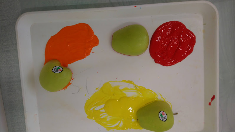 AQUEST MATÍ HEM ESMORZAT POMES. ENS HAN SOBRAT UNES POQUES I LES HEM APROFITAT AQUESTA TARDA PER ESTAMPAR-LES EN UN
