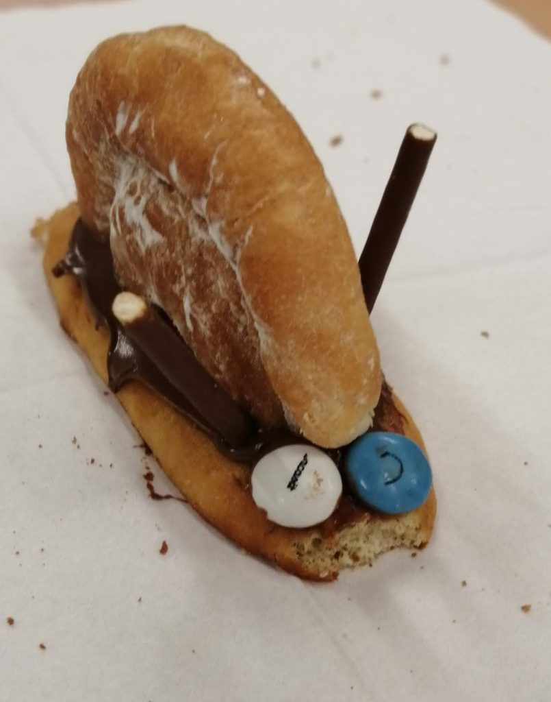Avui els cargols hem fet uns cargols molt originals i divertits amb un melindro (peu), dos bastonets de xocolata (banyes),