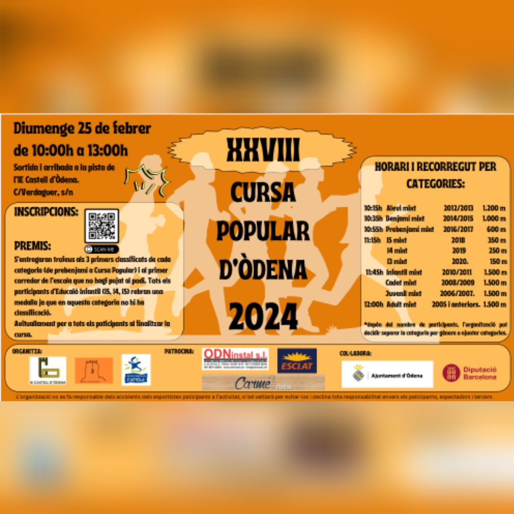 Nois! Noies! Famílies! Esportistes! Ja la tenim aquí! El proper diumenge 25 de febrer celebrarem la XXVIII Cursa Popular d’Òdena.