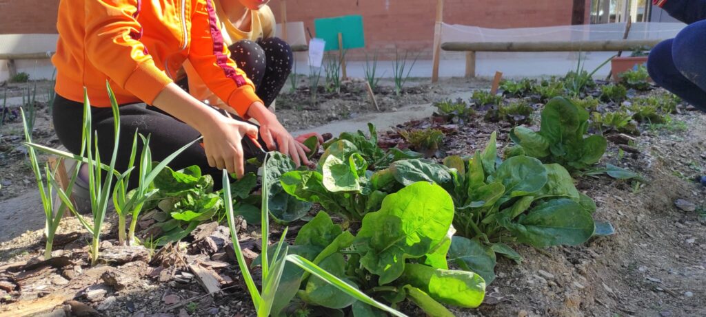Els alumnes de l’IE Castell d’Òdena ha collit les primeres fulles d’espinacs que van plantar ja fa un parell de