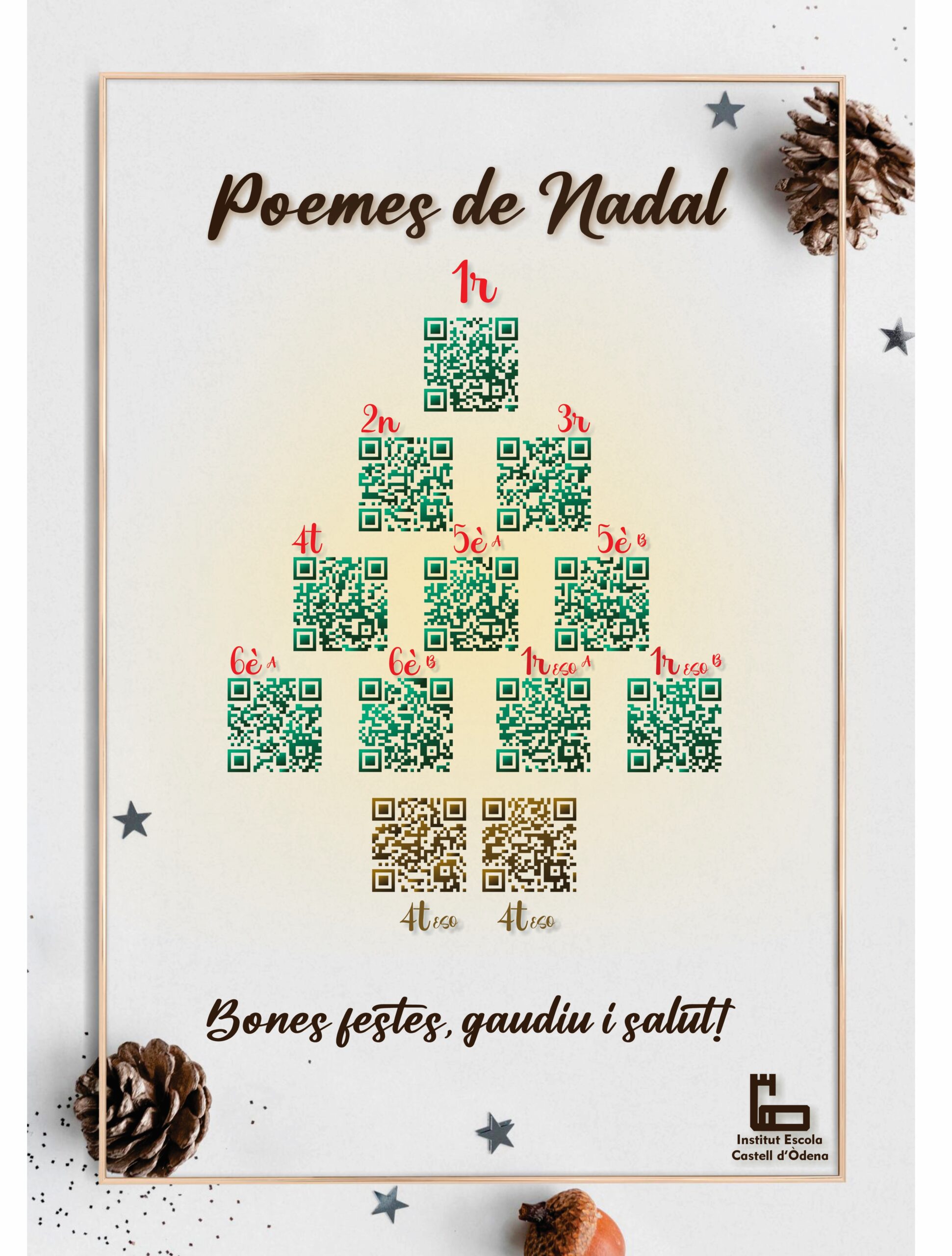Com veieu, hem dissenyat una imatge en forma d’arbret de Nadal, d’on s’hi pengen codis QR pertanyents a diferents cursos escolars. Només cal obrir els codis amb l’aplicació mòbil, i disfrutar del poemari.