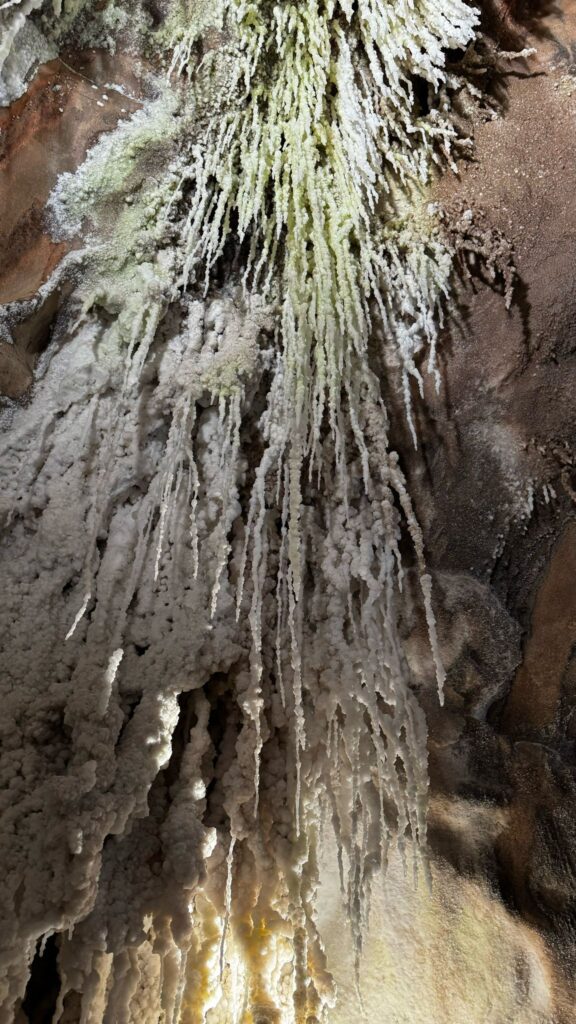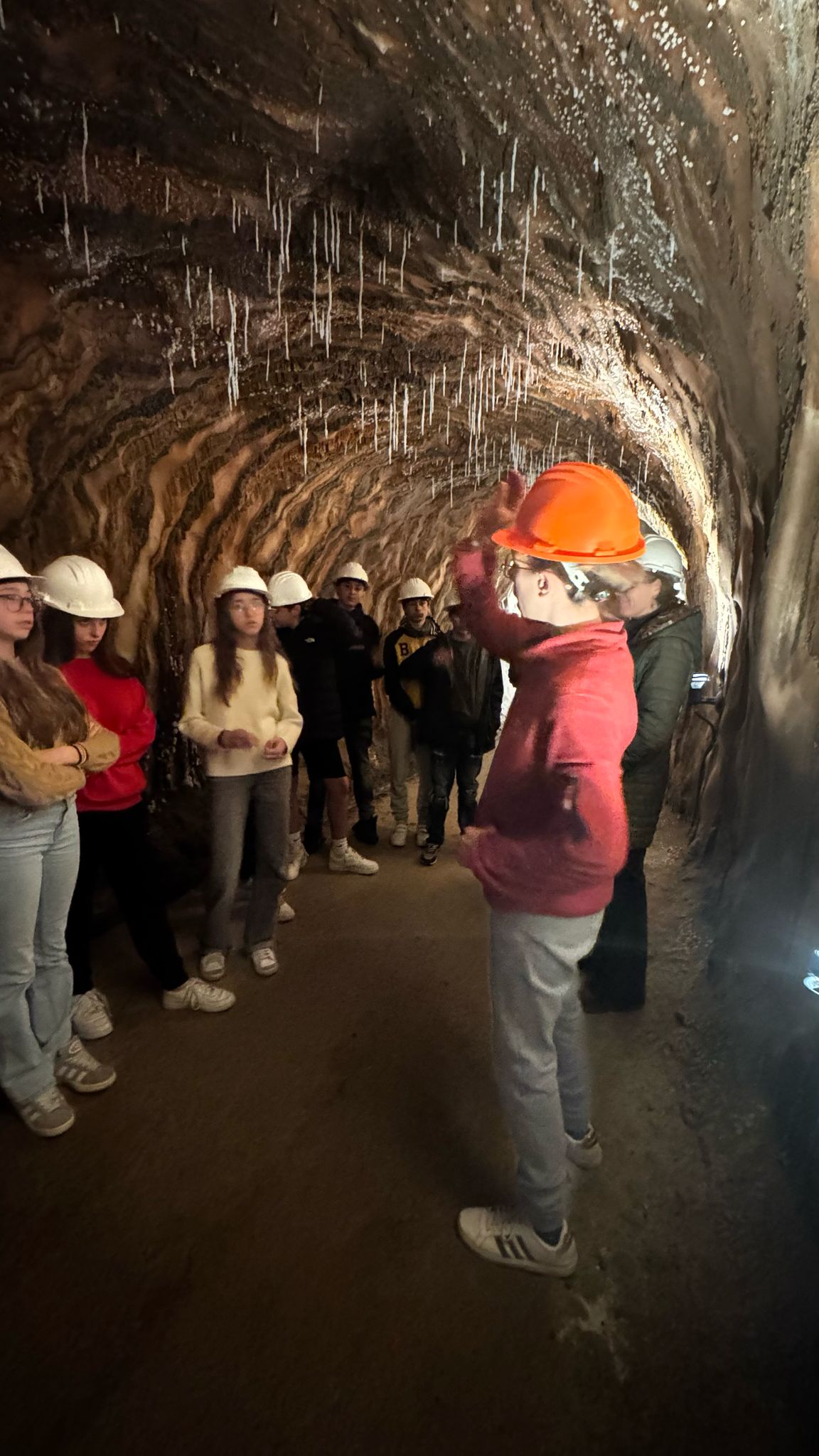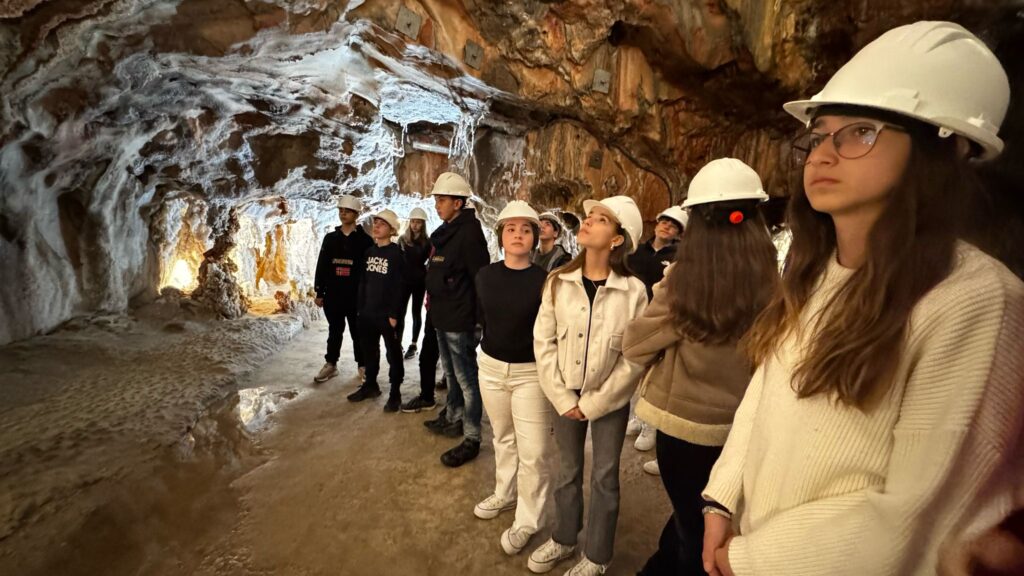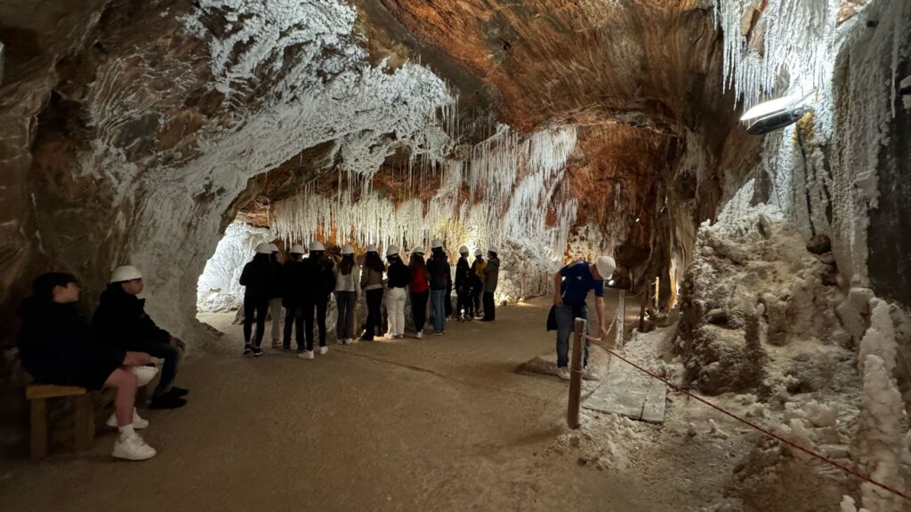 La primera parada en arribar a la ciutat bagenca va ser a la zona de pícnic situada al fons del poble i ben a la vora del Parc Cultural de la Muntanya de Sal. L’alumnat va disposar d’una estona per a esmorzar, i seguidament va traslladar-se en furgonetes al peu de la muntanya, on va iniciar-se la visita a la mina de sal. Es tracta d’un recorregut guiat d’uns cinc-cents metres per les galeries subterrànies de la mina, a una temperatura d’entre els catorze i els setze graus. Una visita cultural molt atractiva que explica, entre d’altres, la insòlita formació geològica de la mina, l’explotació salina a través dels temps i fins al tancament de la mina potàssica el 1990, i la importància econòmica i històrica d’aquesta en el sí de la vila. Addicionalment, la visita ofereix l’oportunitat de presenciar en directe les impressionants formacions naturals que hi habiten, i descobrir la vida i el treball dels miners al llarg dels segles.